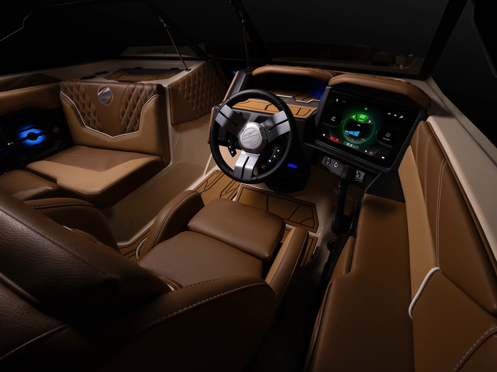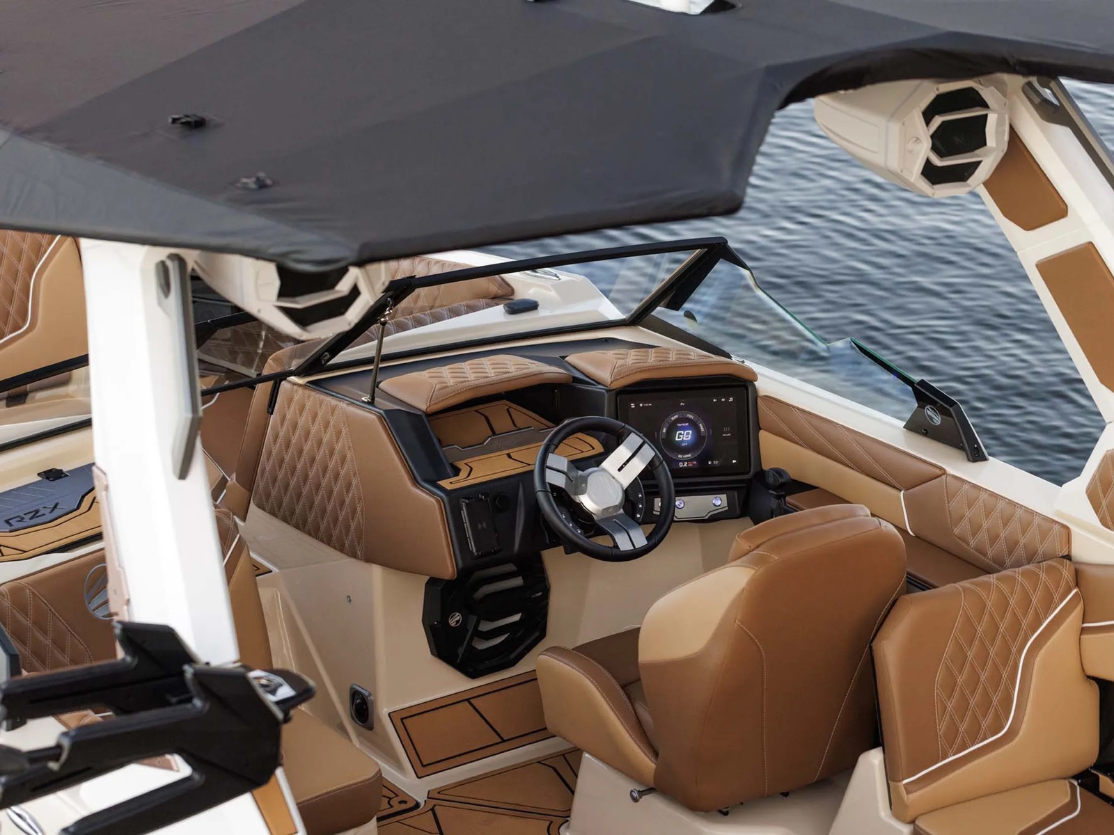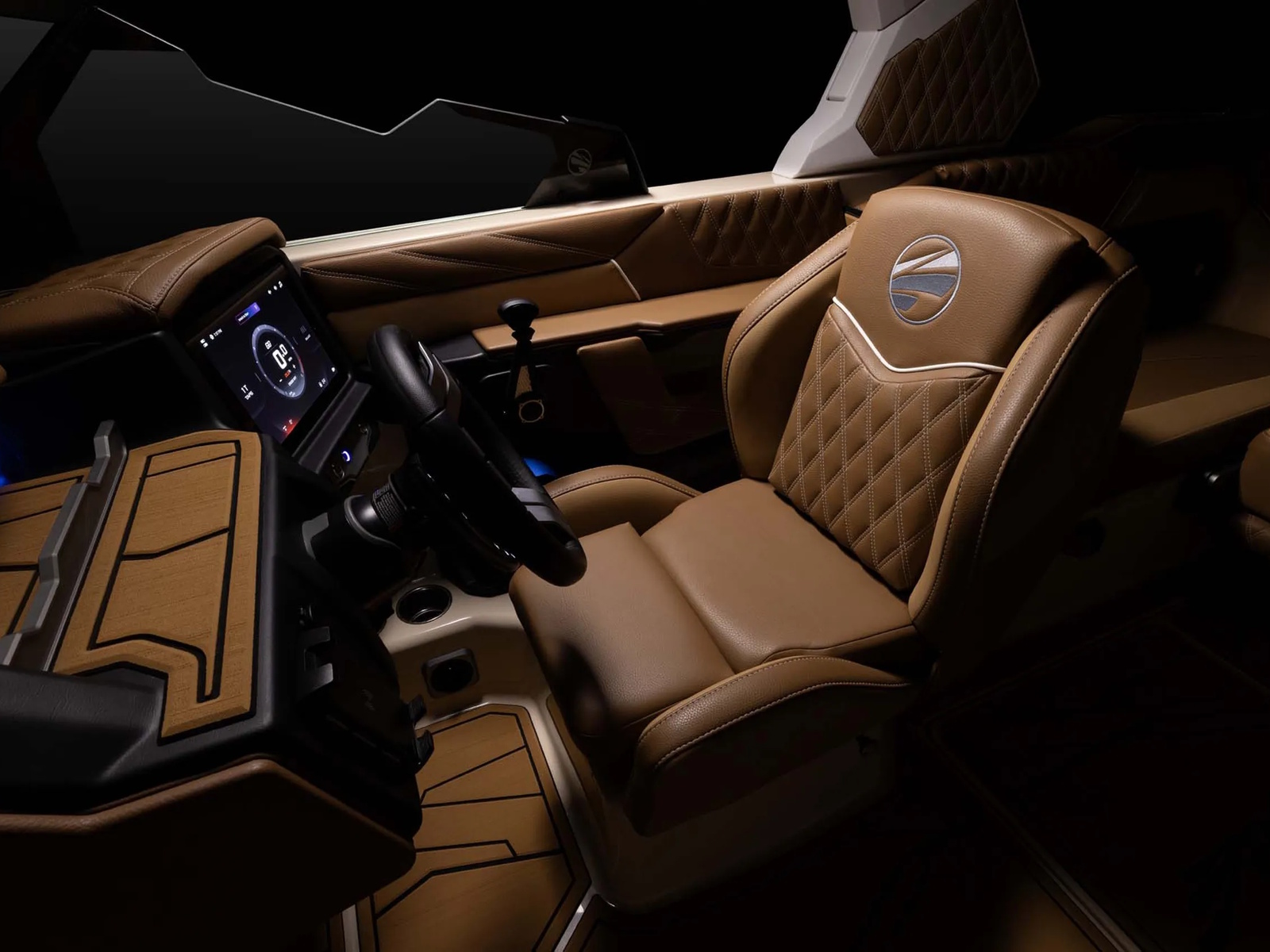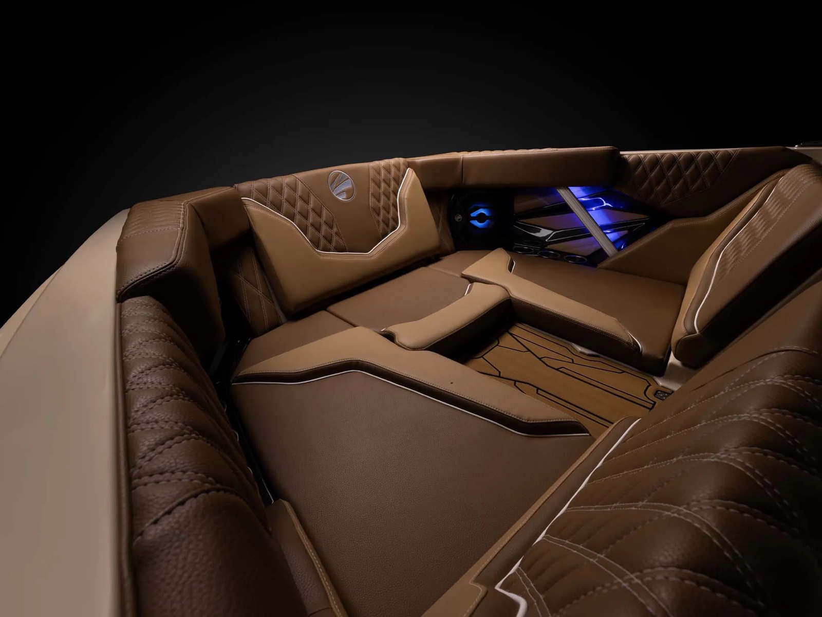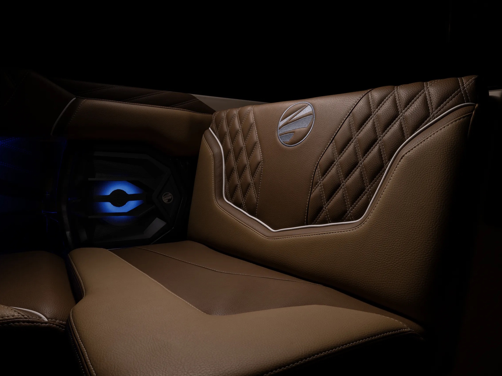 The bold redesign of the 22RZX is clear the moment you step inside. From functional bow seating to expansive storage, every inch of this luxury boat interior is designed for maximum form and function. The double diamond stitching elevates the premium wake boat experience, while incredible depth lets you fully sink into the ride. This is craftsmanship that performs as beautifully as it looks.