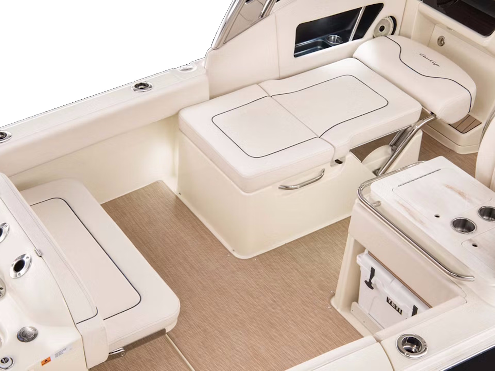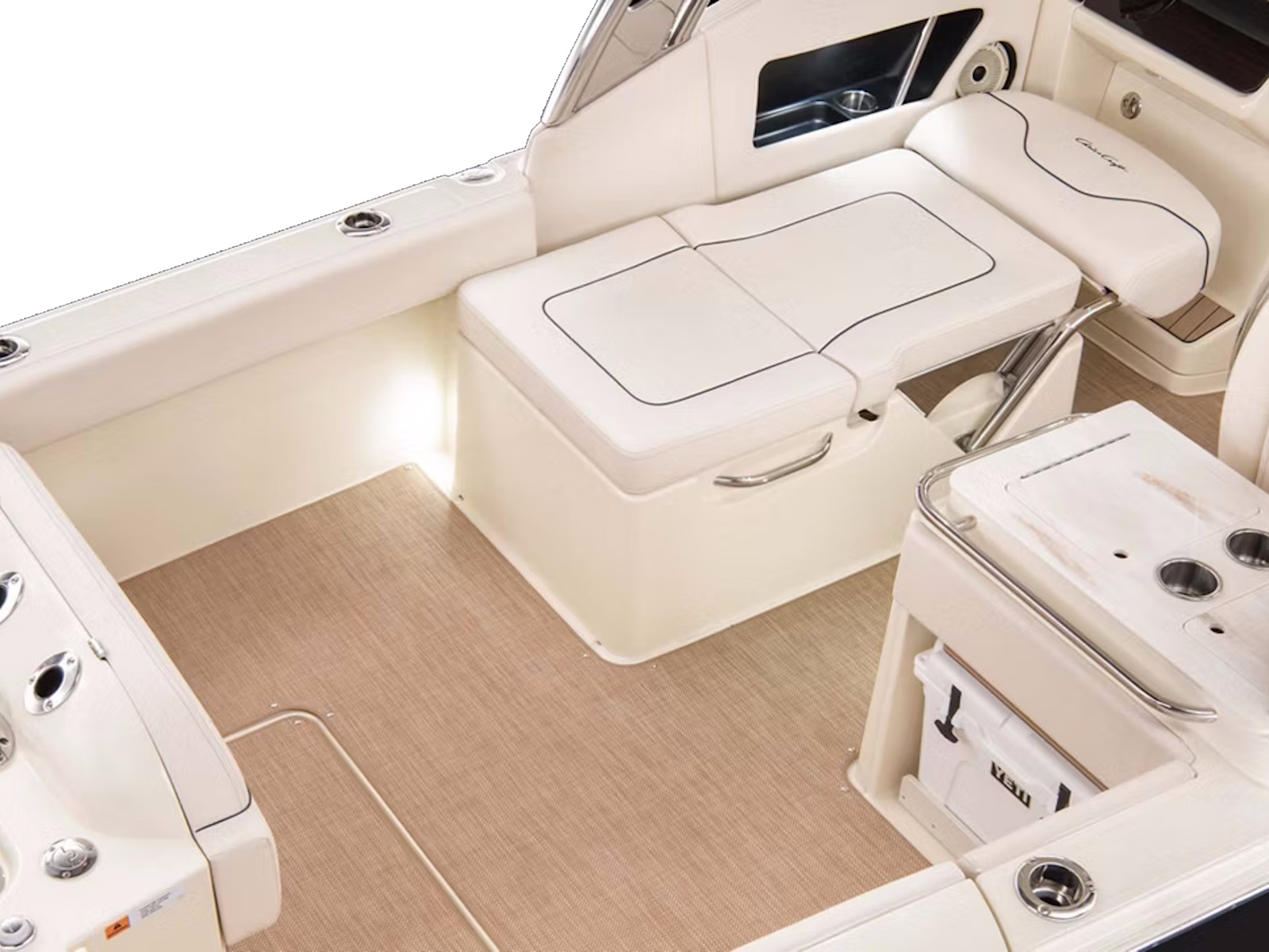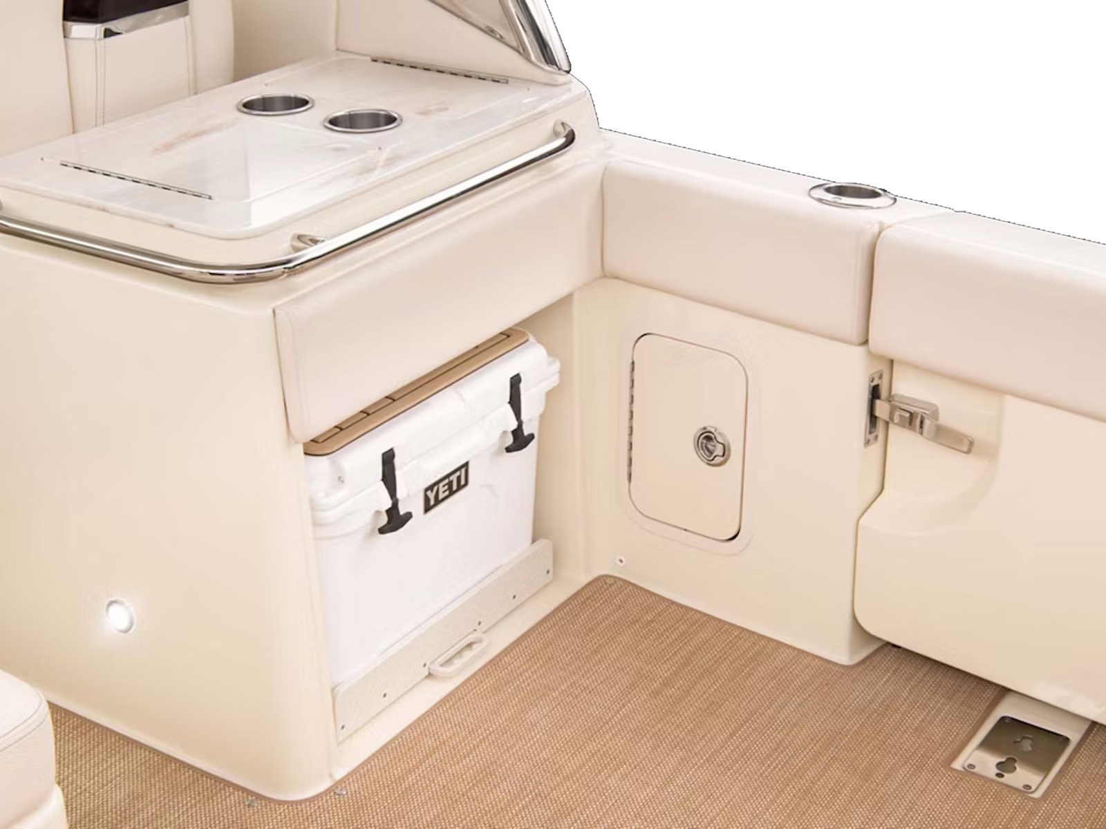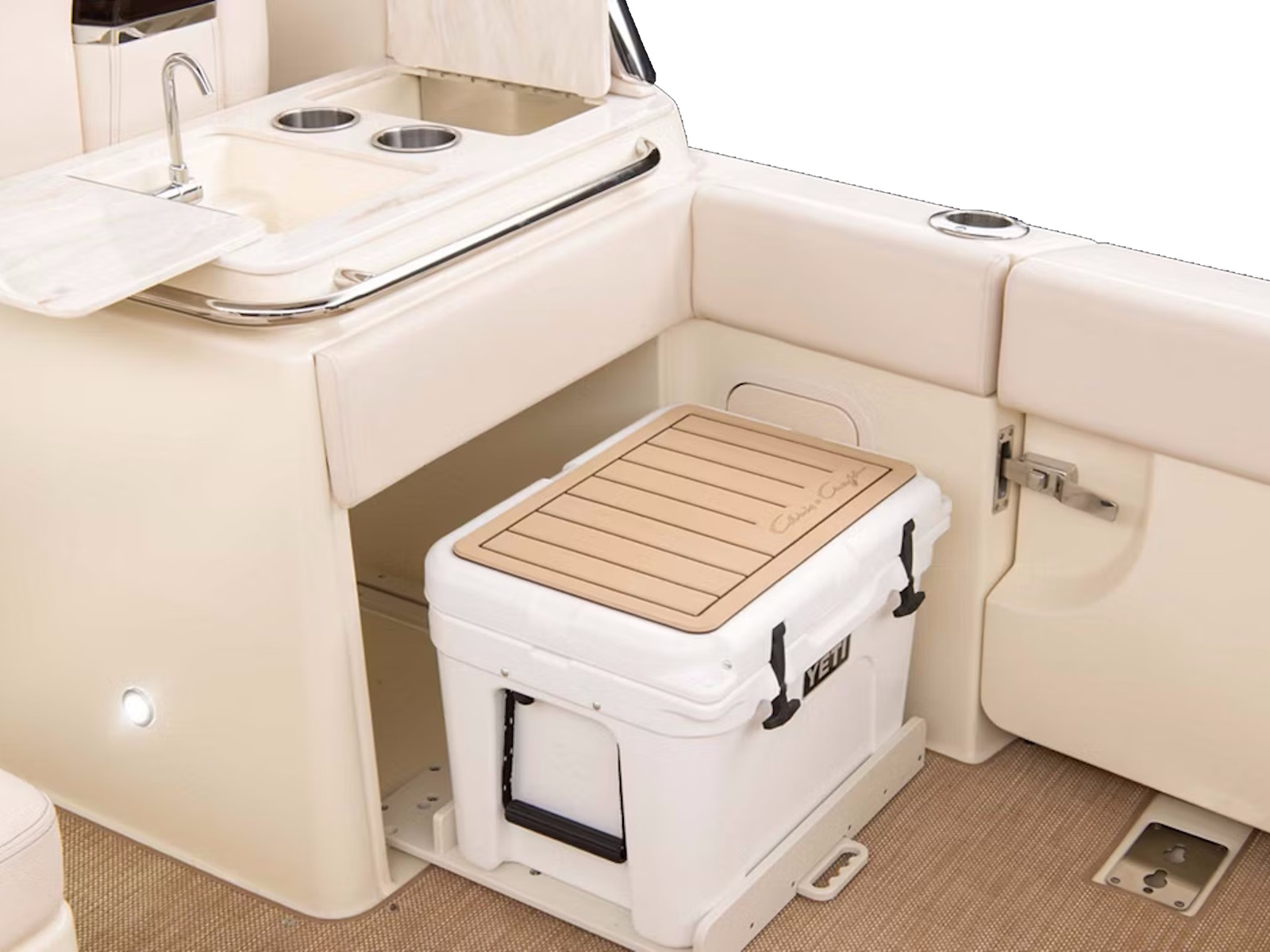 Serve your favorite refreshments with ease. Just slide out the YETI® cooler to access its contents, or use the SofTeak pad as additional seating. A cold-water sink and solid-surface countertop help with prep and cleanup, while an optional teak table stows out of the way when not in use.
