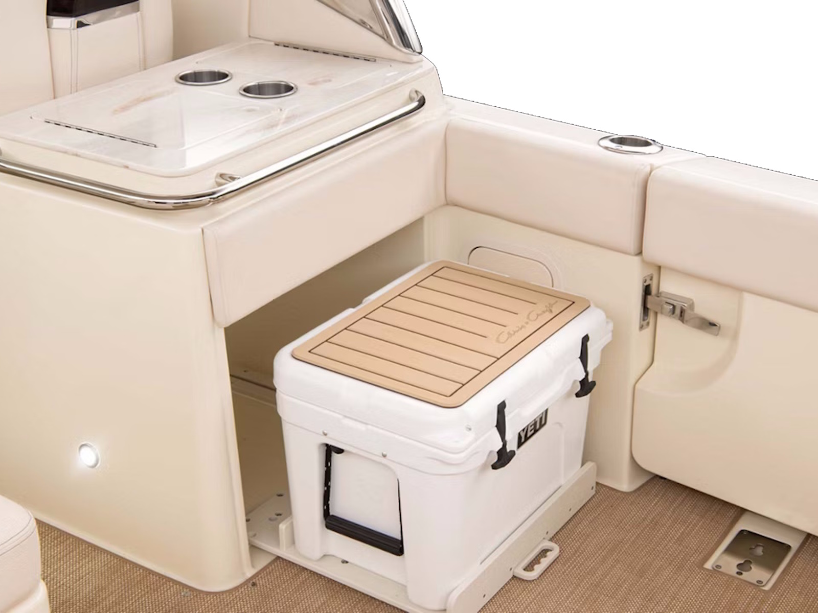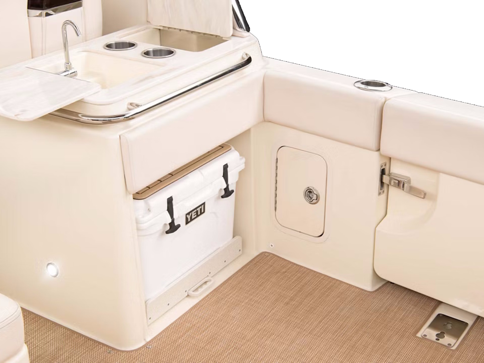 Serve your favorite refreshments with ease. Just slide out the YETI® cooler to access its contents, or use the SofTeak pad as additional seating. A cold-water sink and solid-surface countertop help with prep and cleanup, while an optional teak table stows out of the way when not in use.