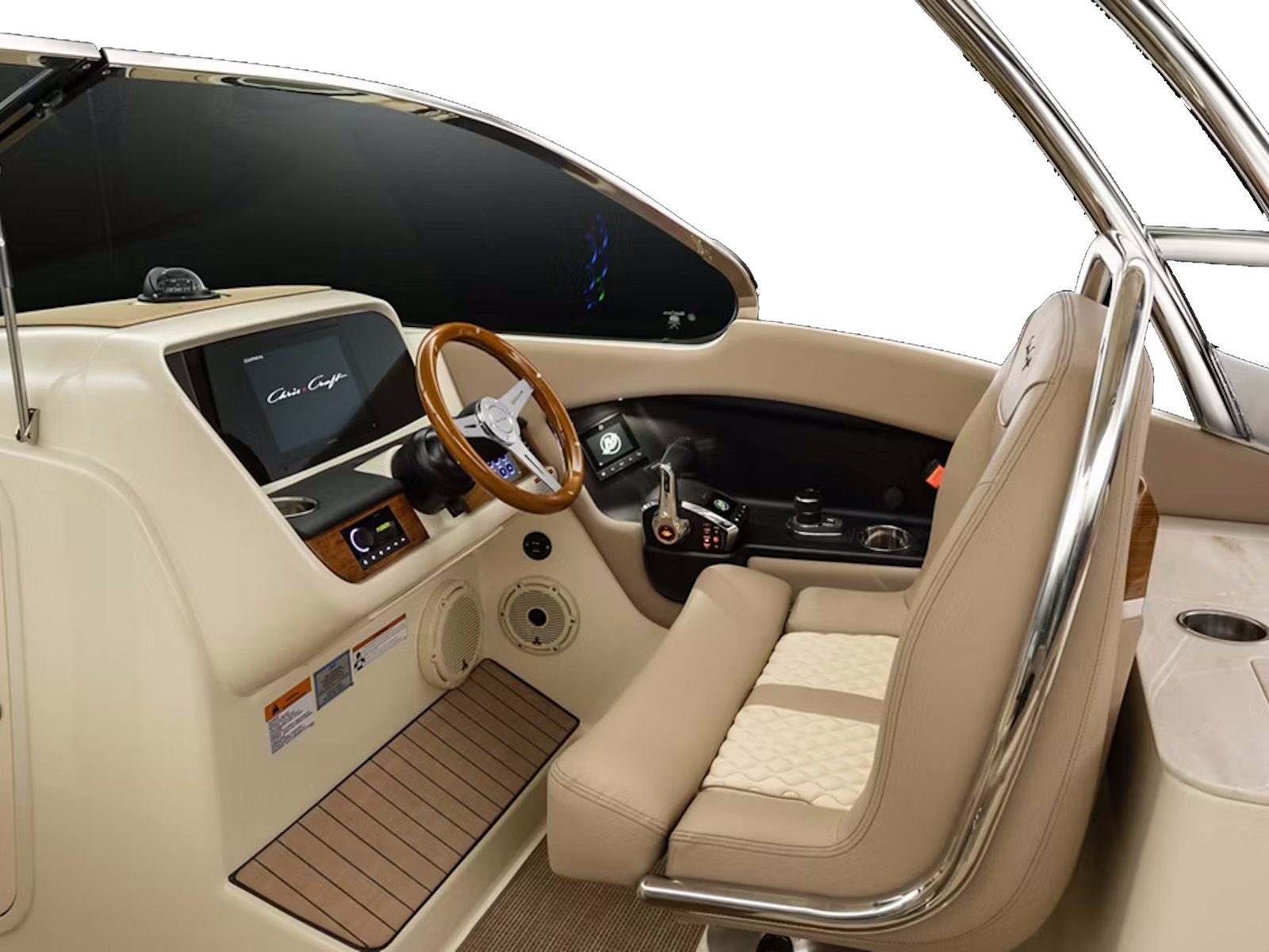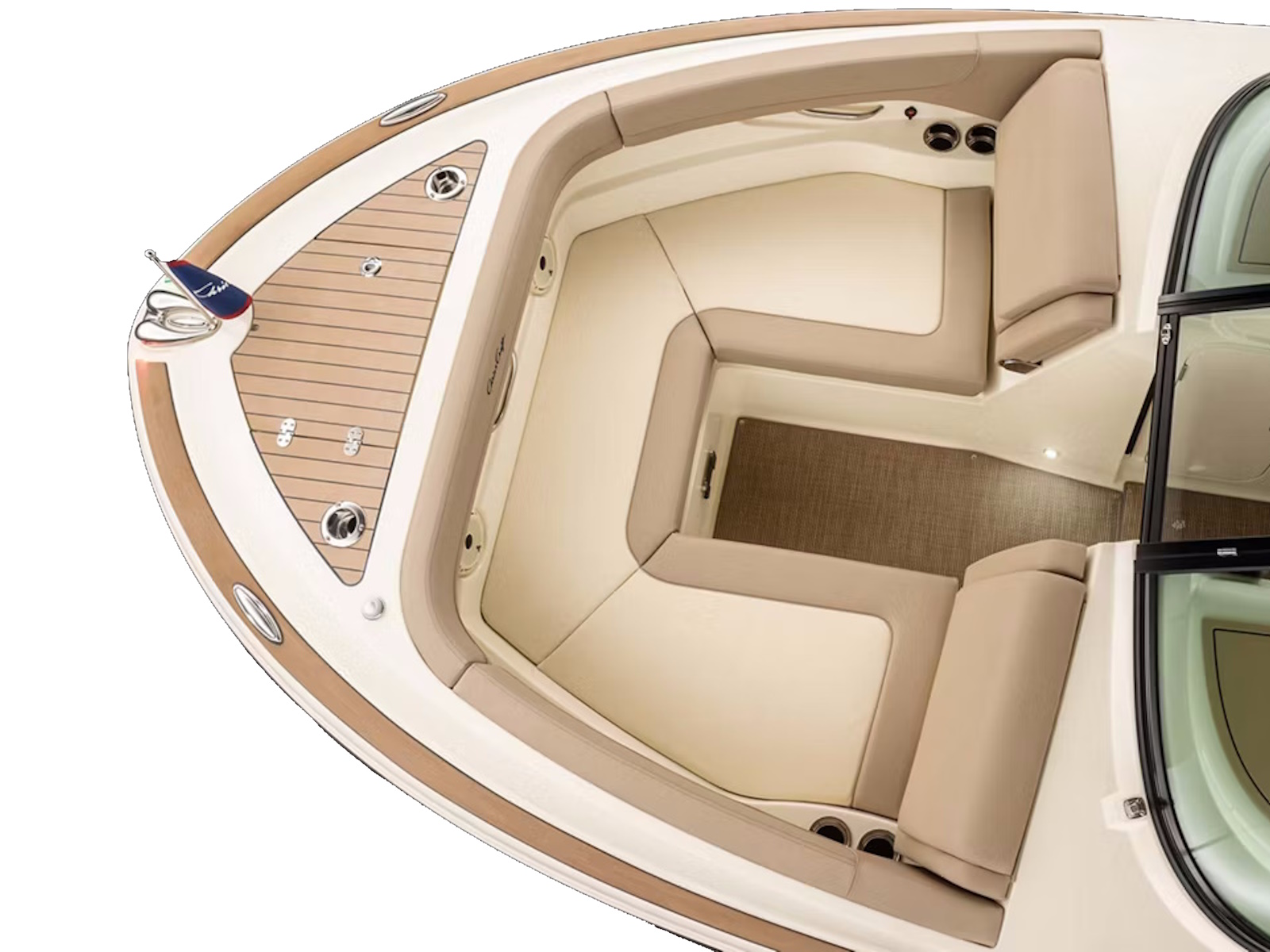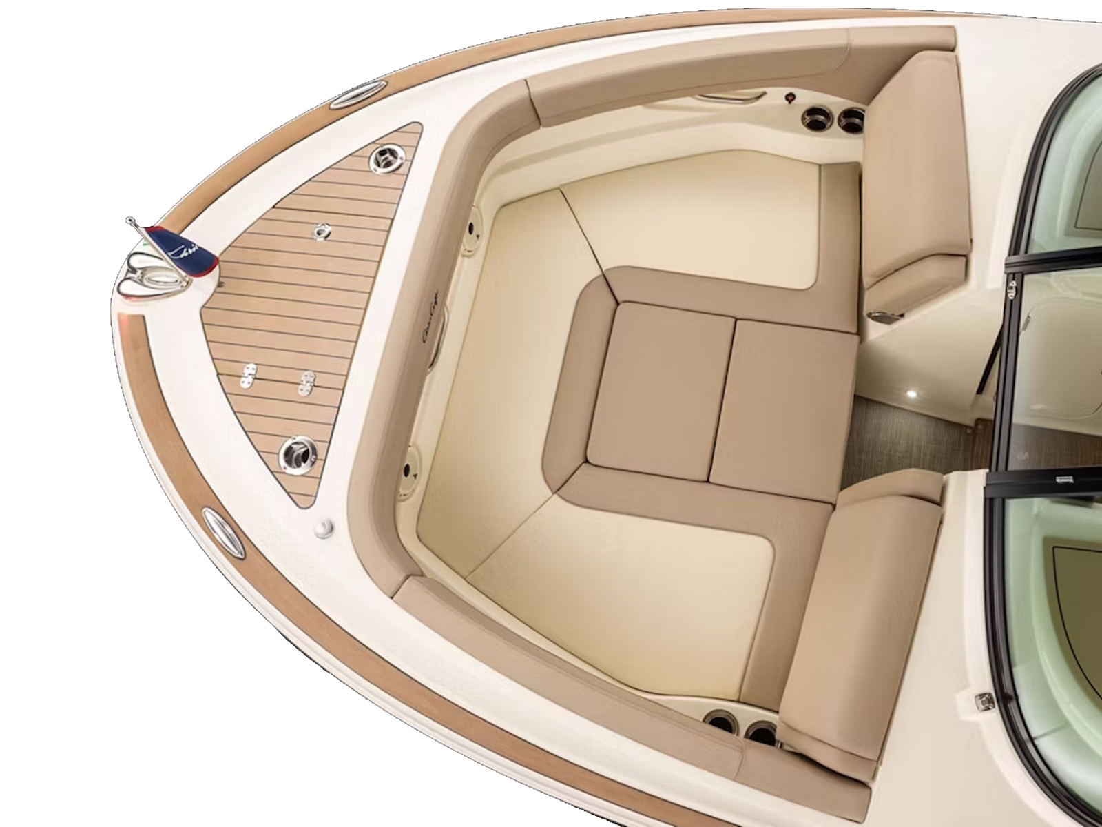The u-shaped bow seating includes forward-facing sunloungers with USB charging ports and plenty of cupholders nearby. Chris-Craft upholstery combines the finest marine-grade vinyl with high-density foam featuring antimicrobial and quick-drying properties for easy living.