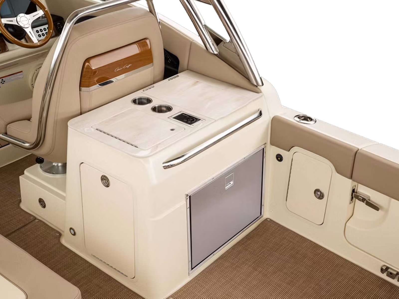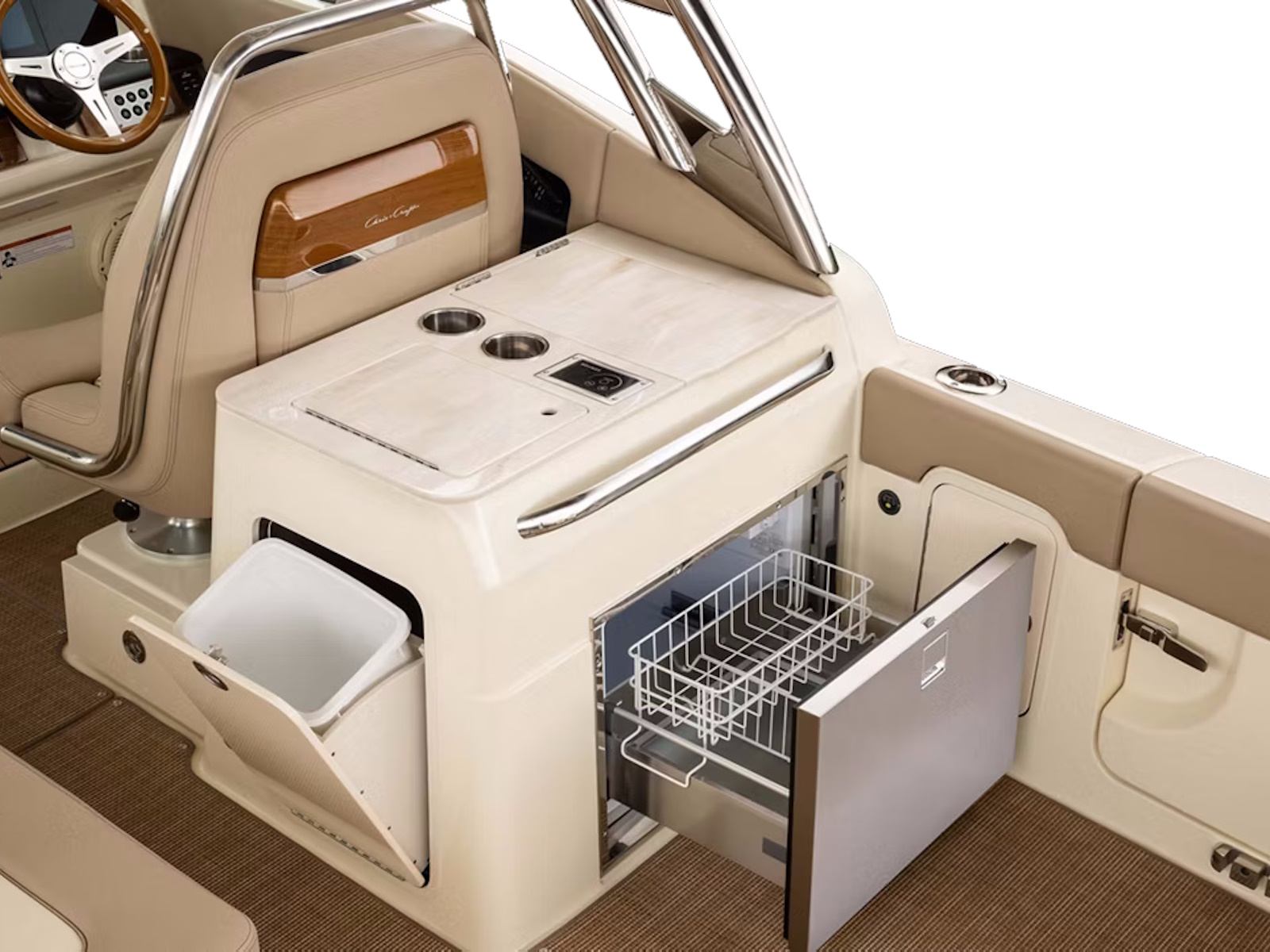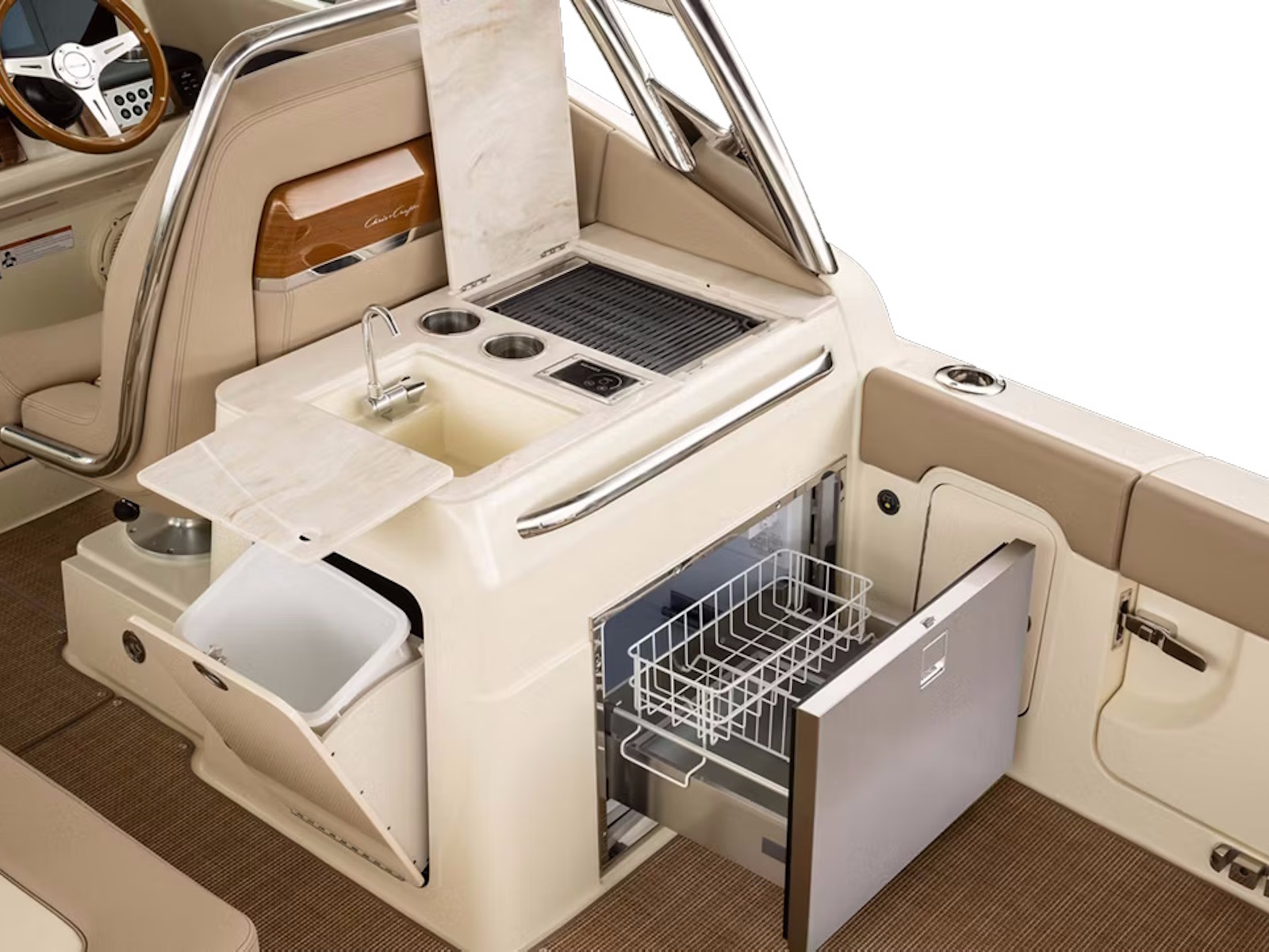 Position the convertible backrest on the port helm seat to face aft and join those seated around the optional teak table. The port helm seat also adjusts for use as a forward-facing lounger or a flat bench. An optional stainless steel refrigerator and grill complete the galley.