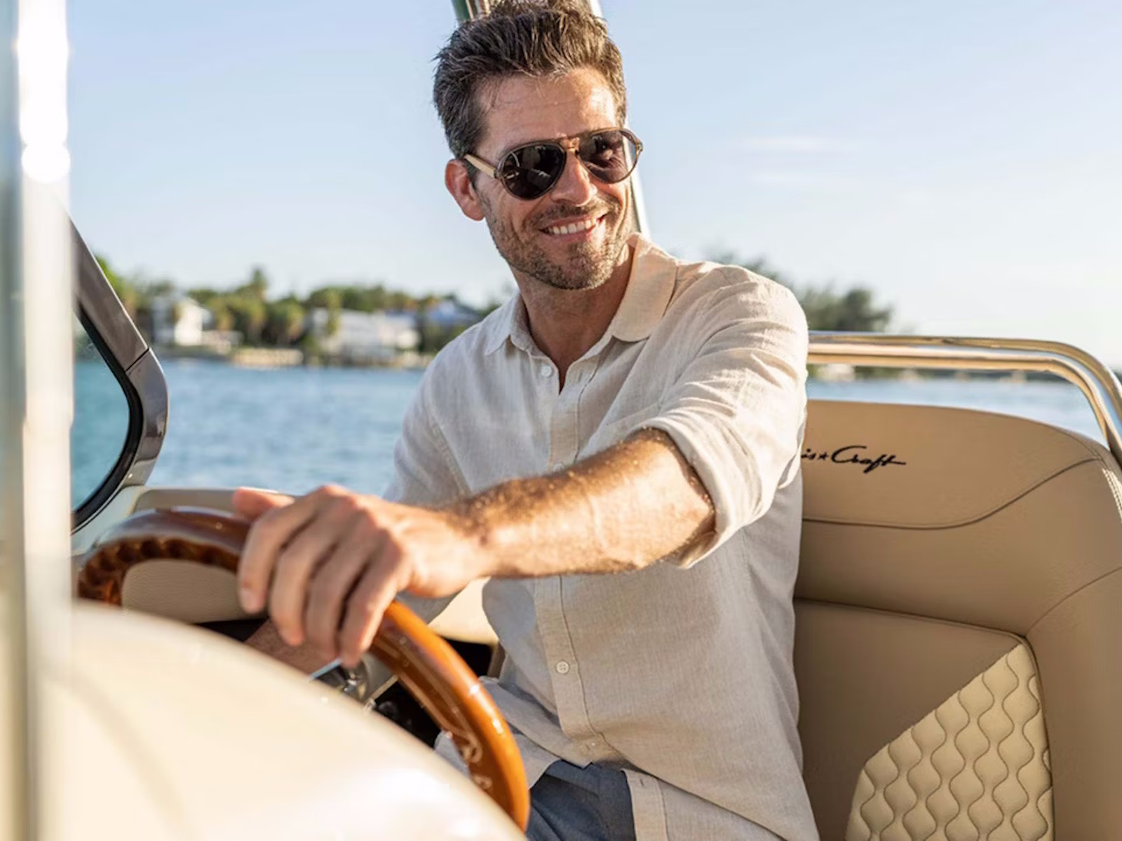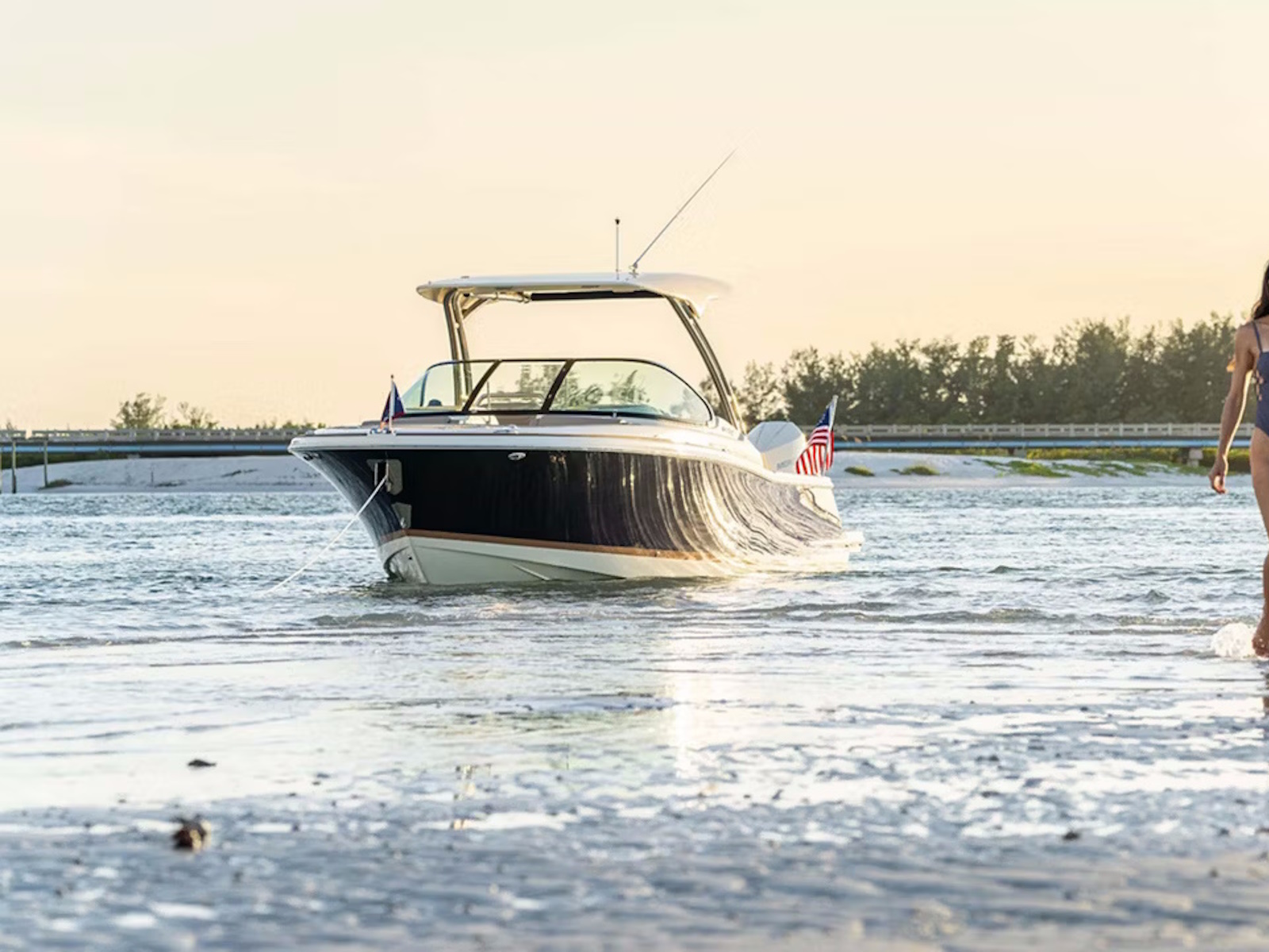 The Calypso 28 offers ample space and all the essential amenities for hosting memorable excursions. For easy access to the dock and the water, a starboard side-boarding door and extended swim platform are both standard. Select the Heritage Edition to enjoy teak accents throughout, including the covering boards, the swim platform, and a full teak floor.