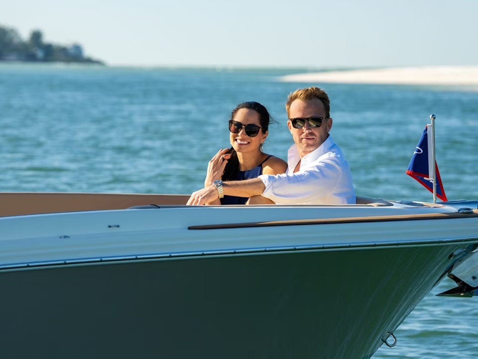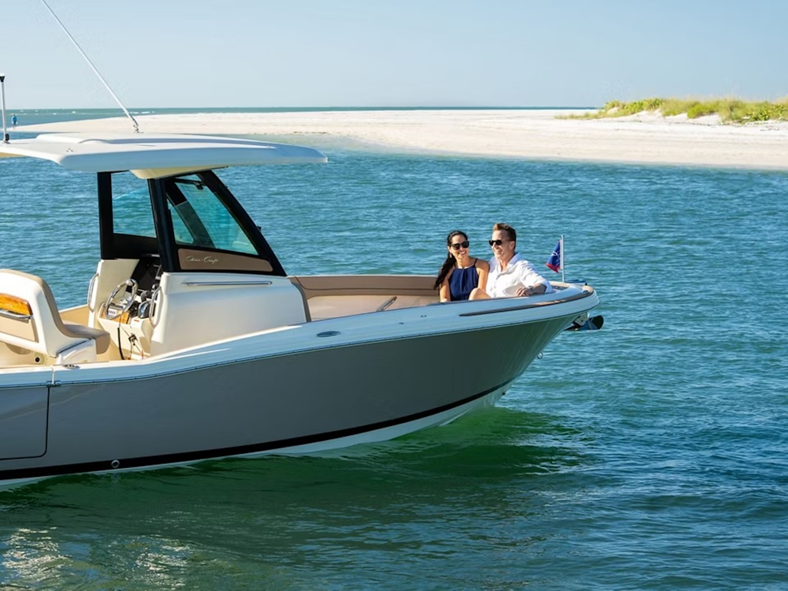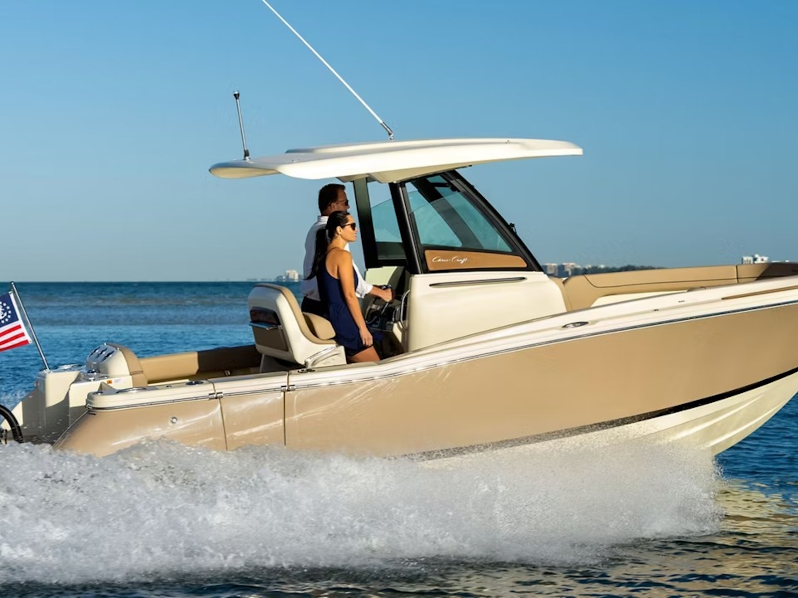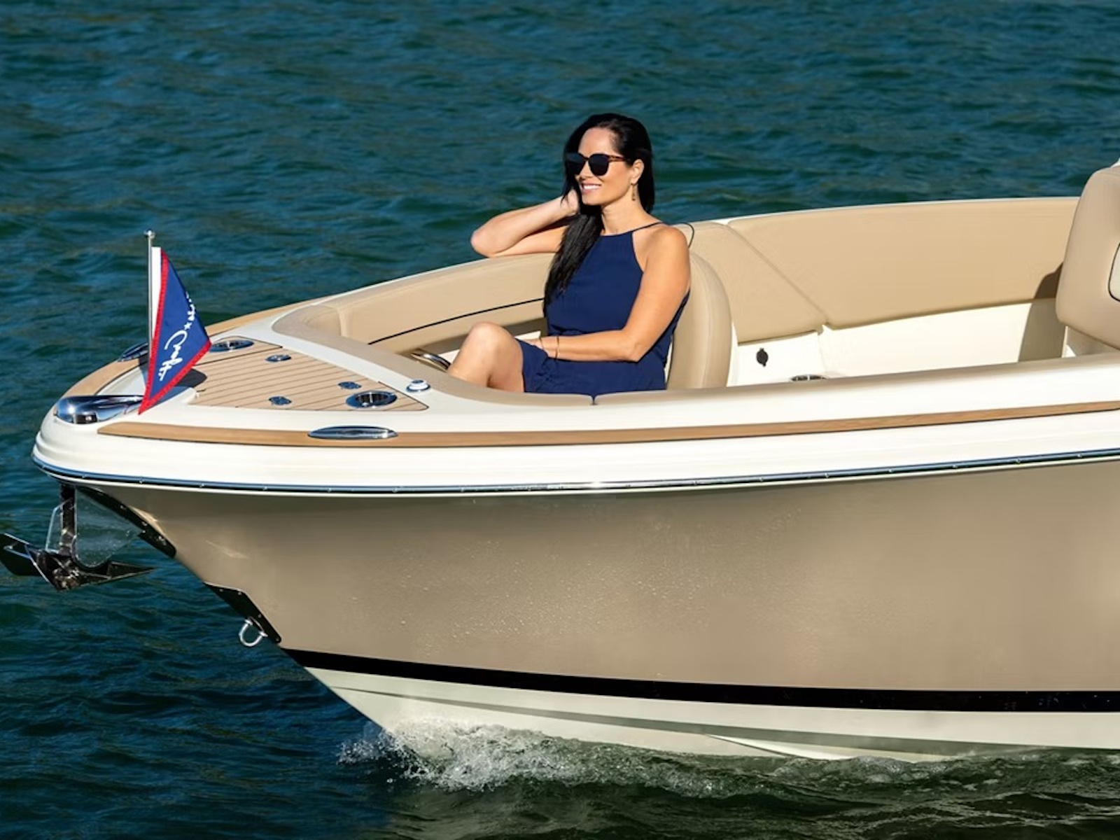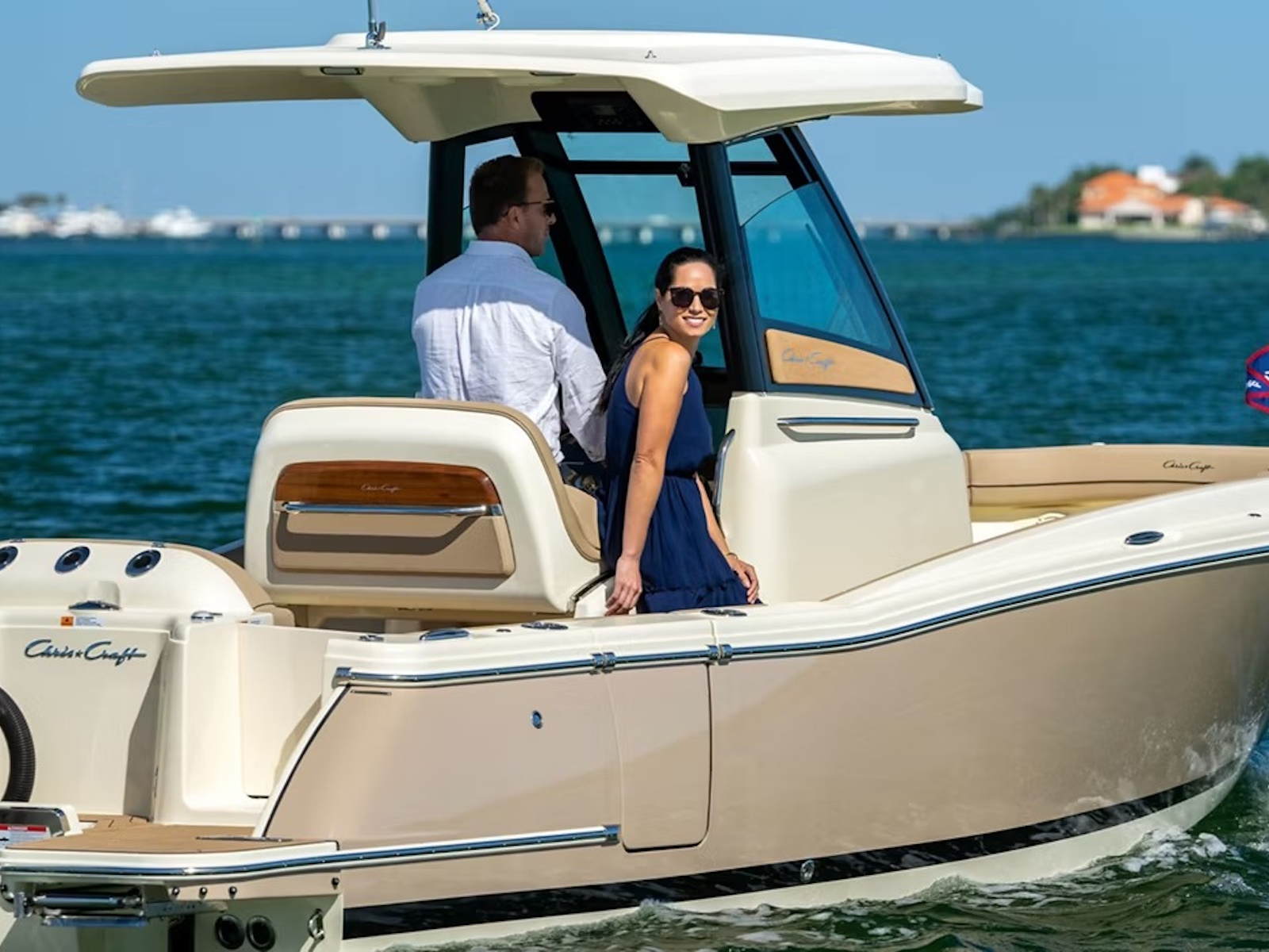 Select the Heritage Edition for a full teak floor, teak covering boards, and teak accents throughout. You can also optimize your Chris-Craft boat with options such as a custom-painted outboard engine, storable Mediterranean sun shades, and a remote-controlled windlass with a stainless steel anchor.