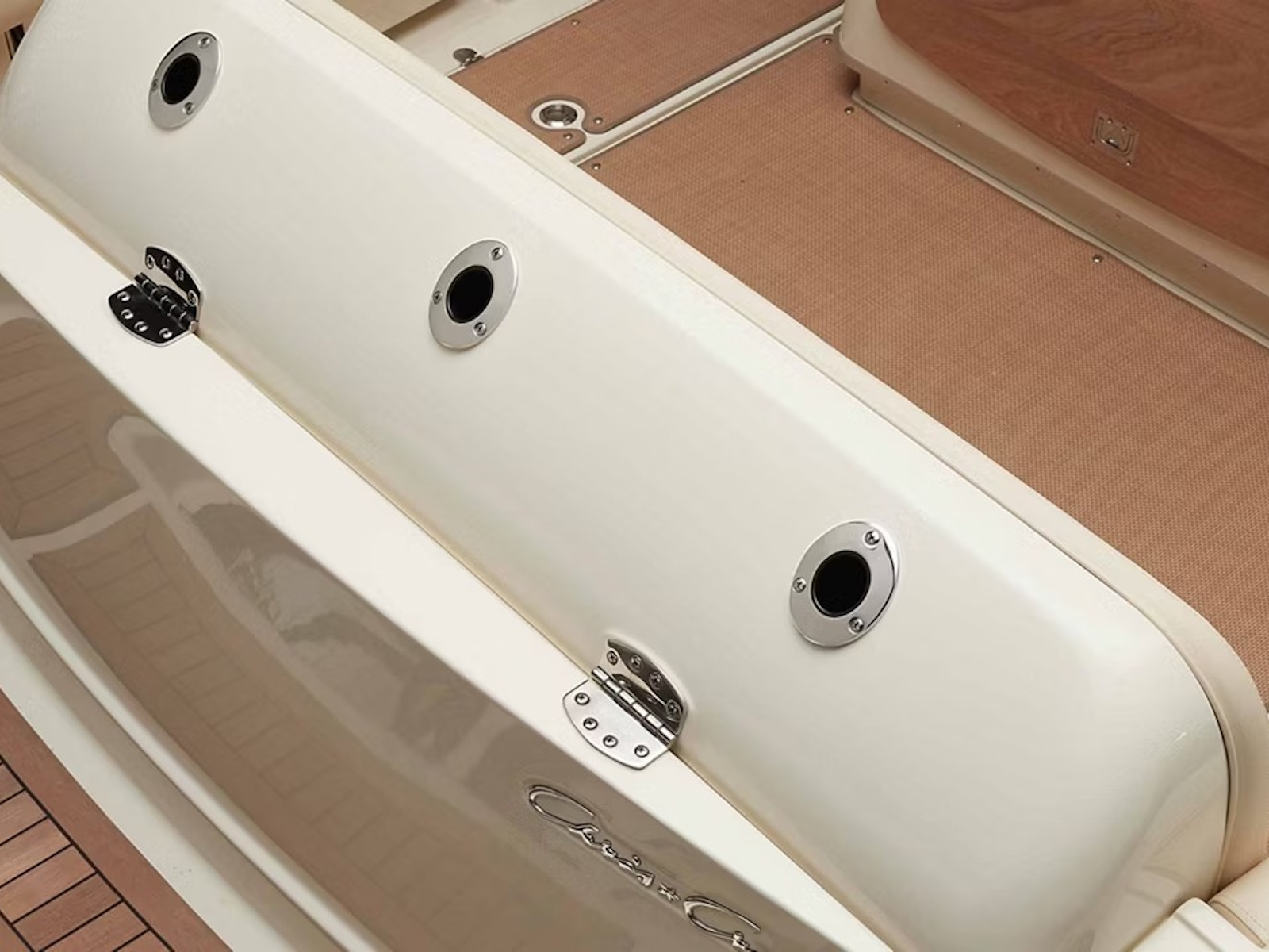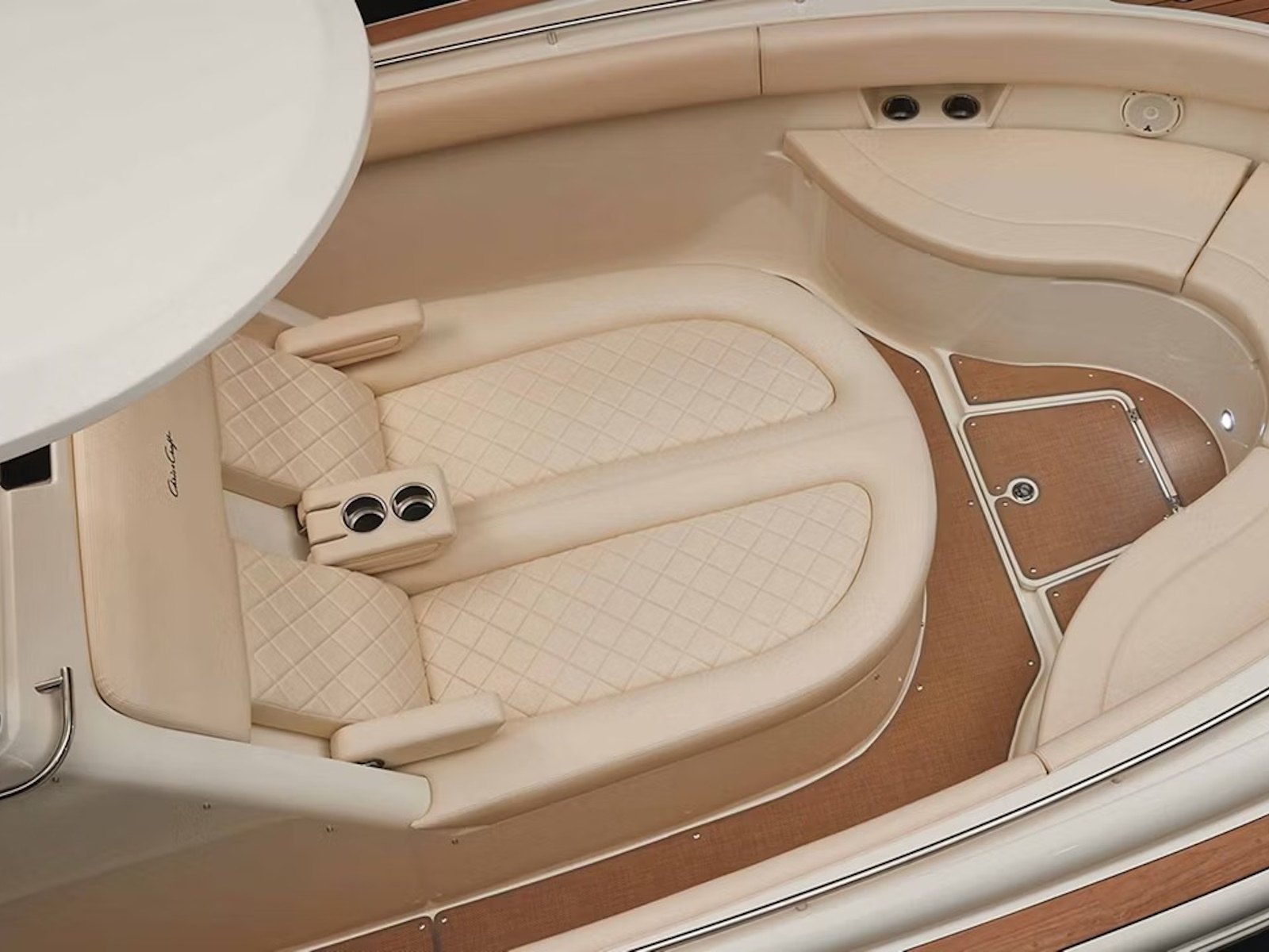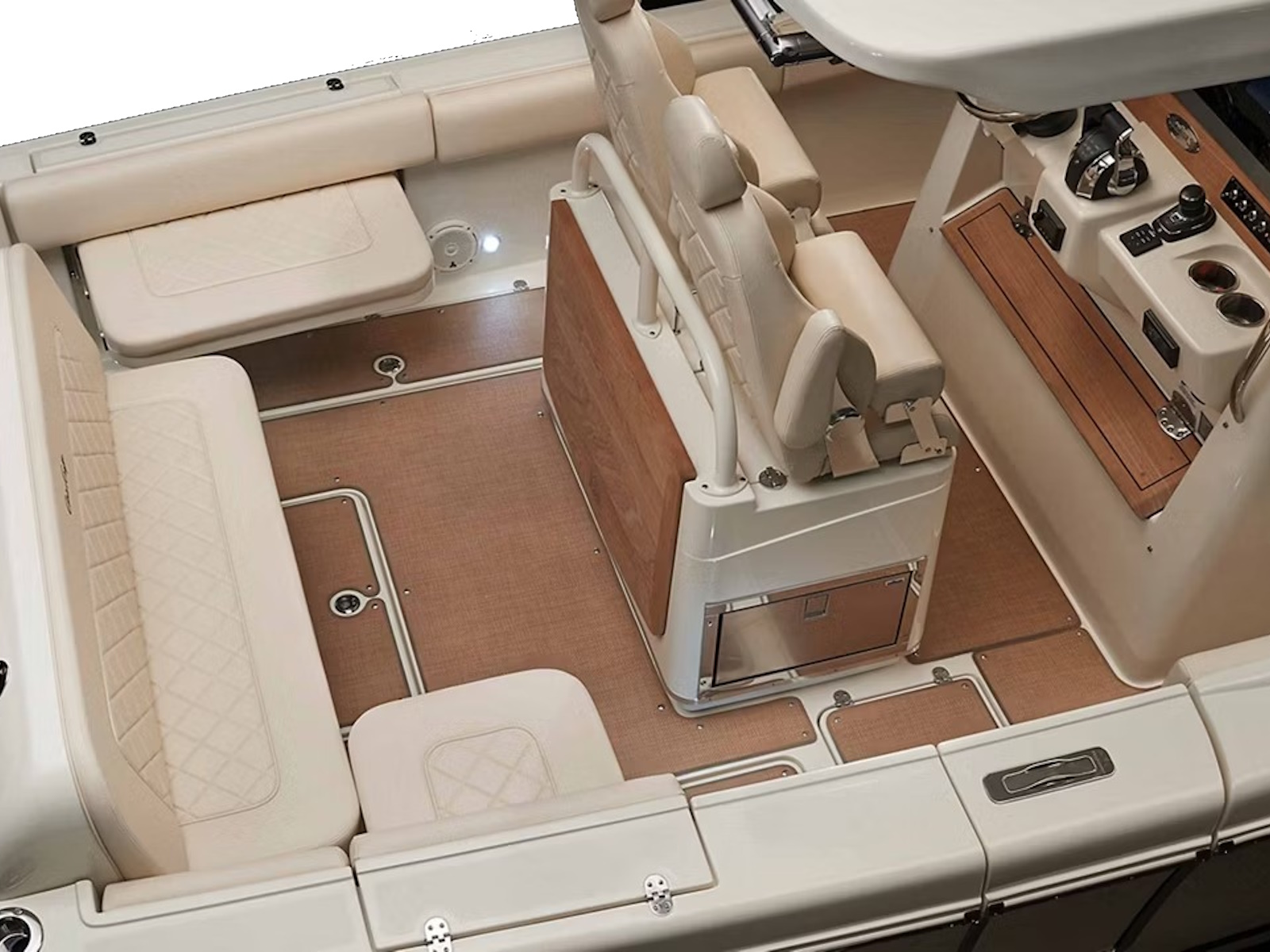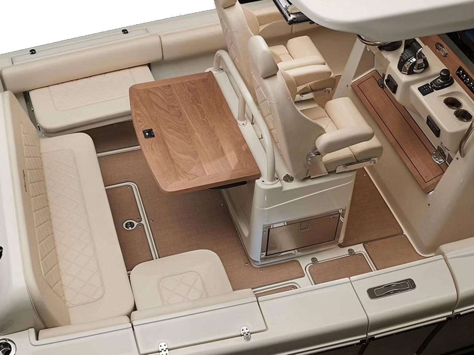 The expansive open bow offers dual forward-facing chaise loungers, as well as lavish wraparound bow seating. Convenience abounds with sealed, fully finished storage lockers in-floor and under the seats, plus well-placed cupholders for entertaining ease.