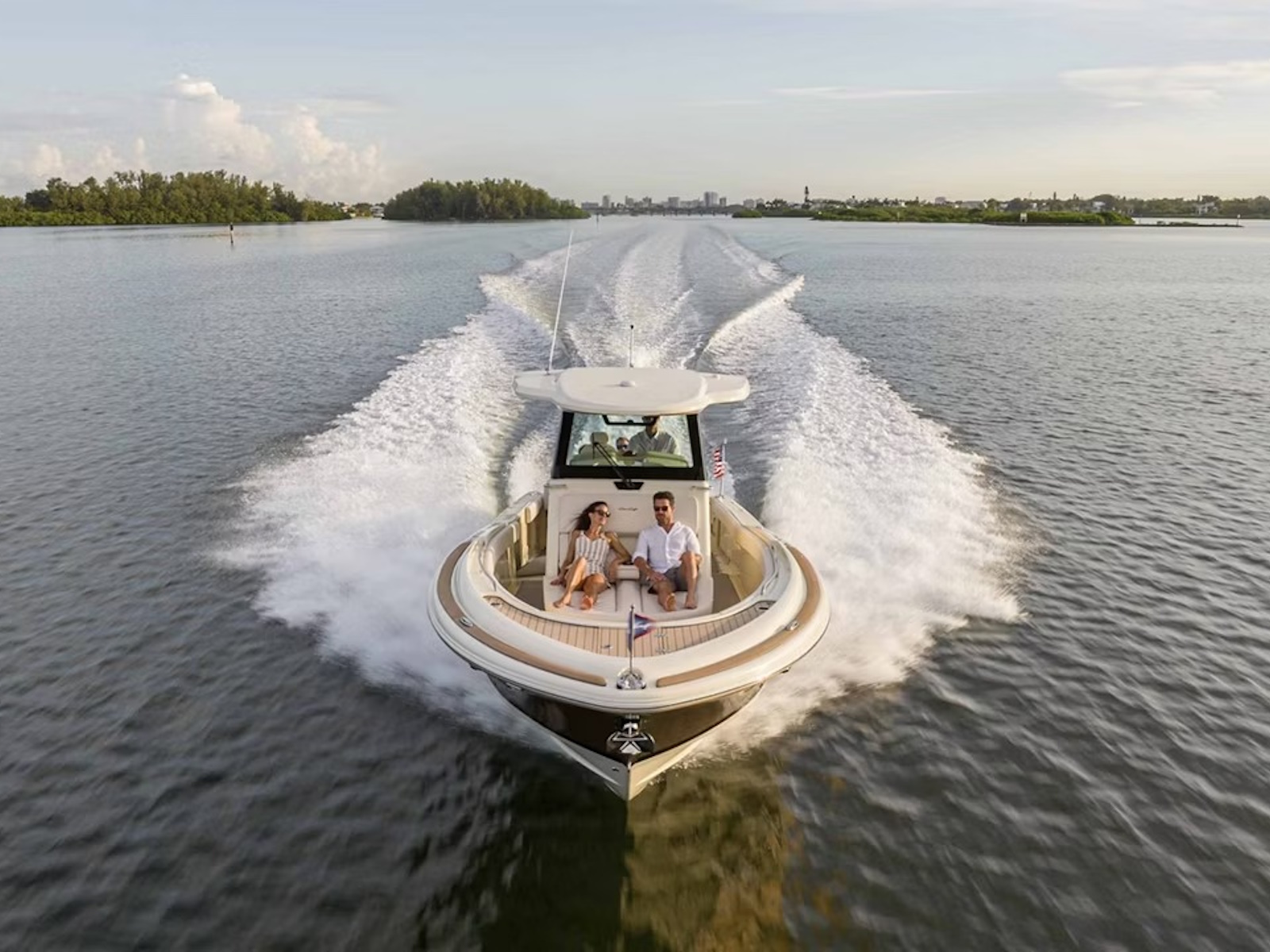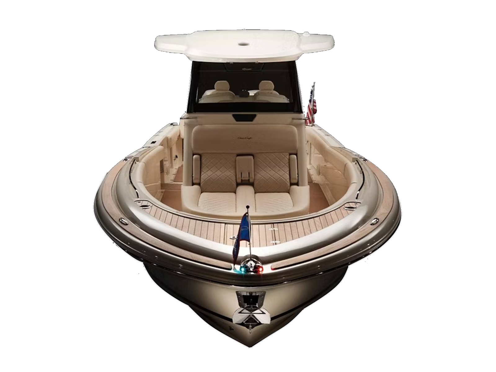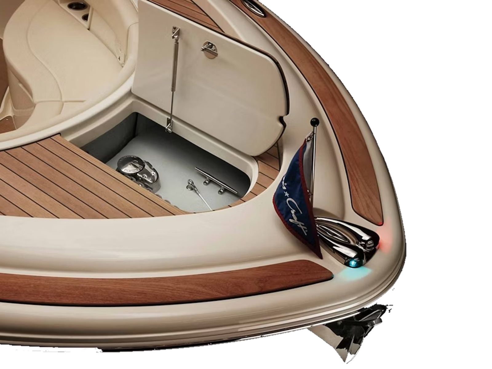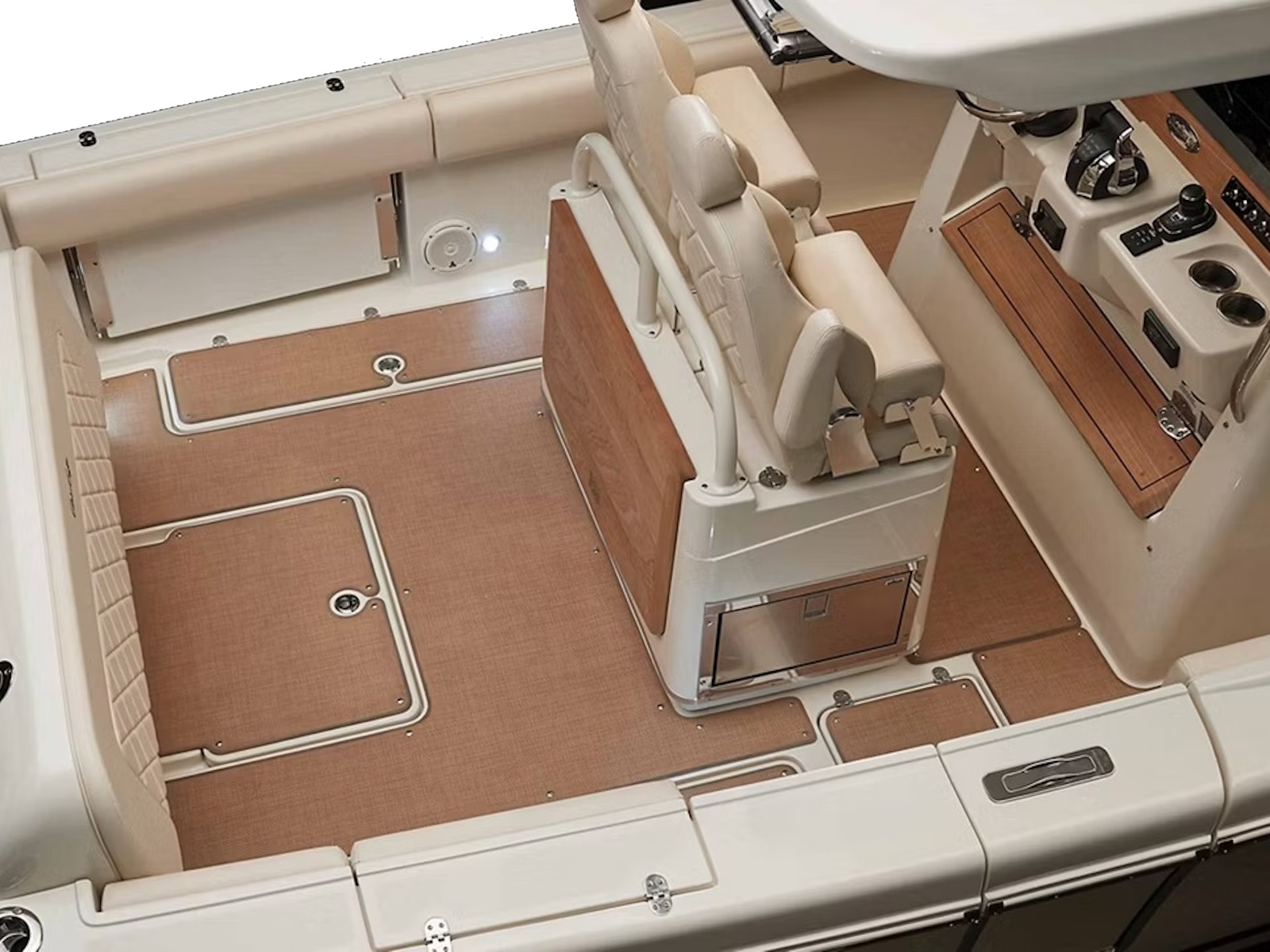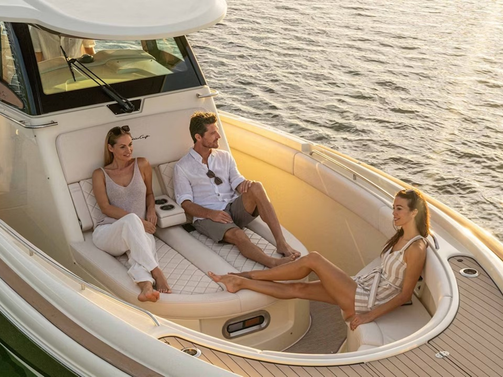 The expansive open bow offers dual forward-facing chaise loungers, as well as lavish wraparound bow seating. Convenience abounds with sealed, fully finished storage lockers in-floor and under the seats, plus well-placed cupholders for entertaining ease.