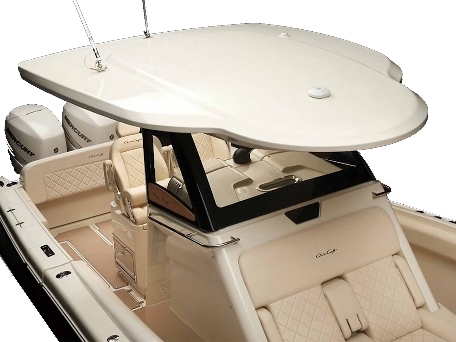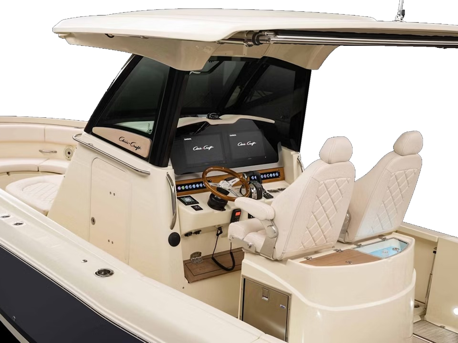 Protected behind the enclosed glass windshield of the pilothouse, dual helm seats put controls at your fingertips with large display screens, customizable LED lighting, and a standard joystick. At the push of a button, the hardtop’s motorized extendable sun shade provides additional coverage.