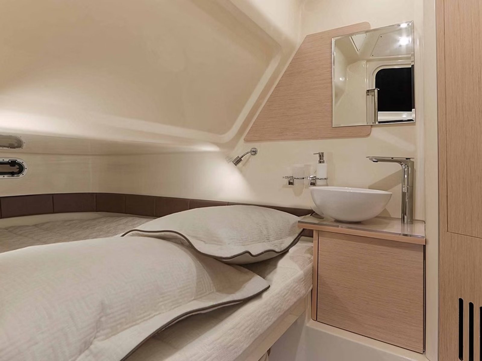 Enjoy an overnight stay in the cabin below, appointed with the wood grain of your choice. A large double bed, head, and sink provide all the essentials. The skylight keeps it feeling light and airy, while available air conditioning keeps it feeling cool.