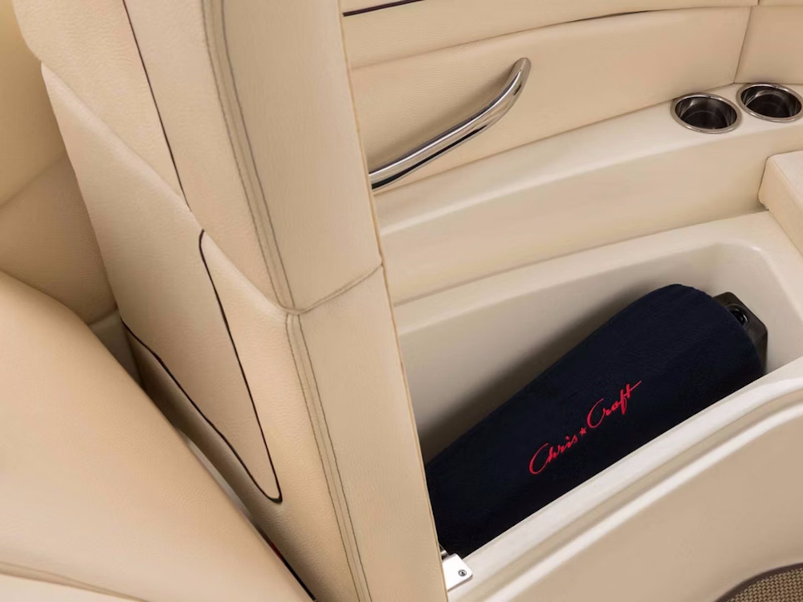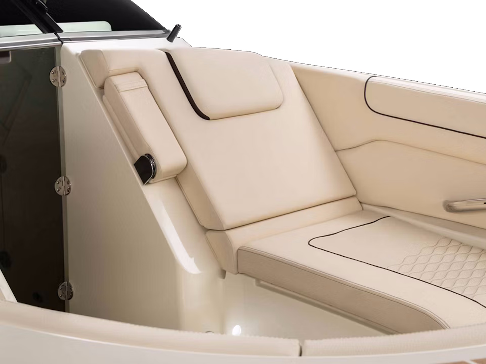 In the bow, plush forward-facing loungers feature fold-up armrests, a relaxed reclining position, and an integrated headrest. Stow fenders and other large items behind the backrests and beneath the seat cushions, as well as in the finished, in-floor storage lockers between these seats.