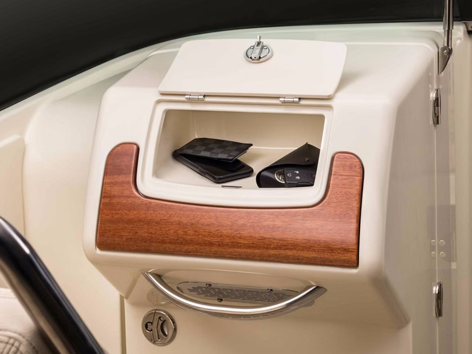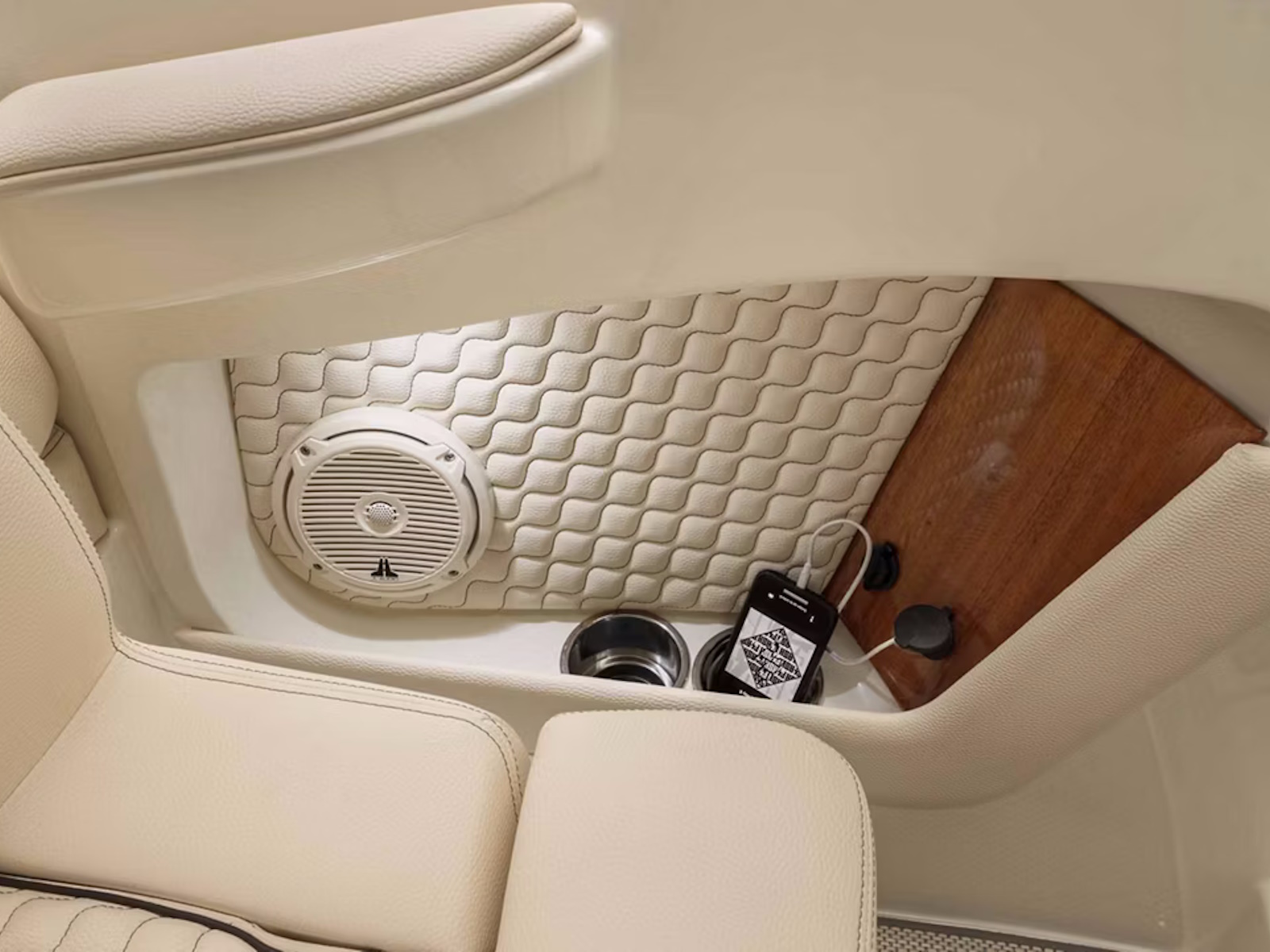 In the bow, plush forward-facing loungers feature fold-up armrests, a relaxed reclining position, and an integrated headrest. Stow fenders and other large items behind the backrests and beneath the seat cushions, as well as in the finished, in-floor storage lockers between these seats.