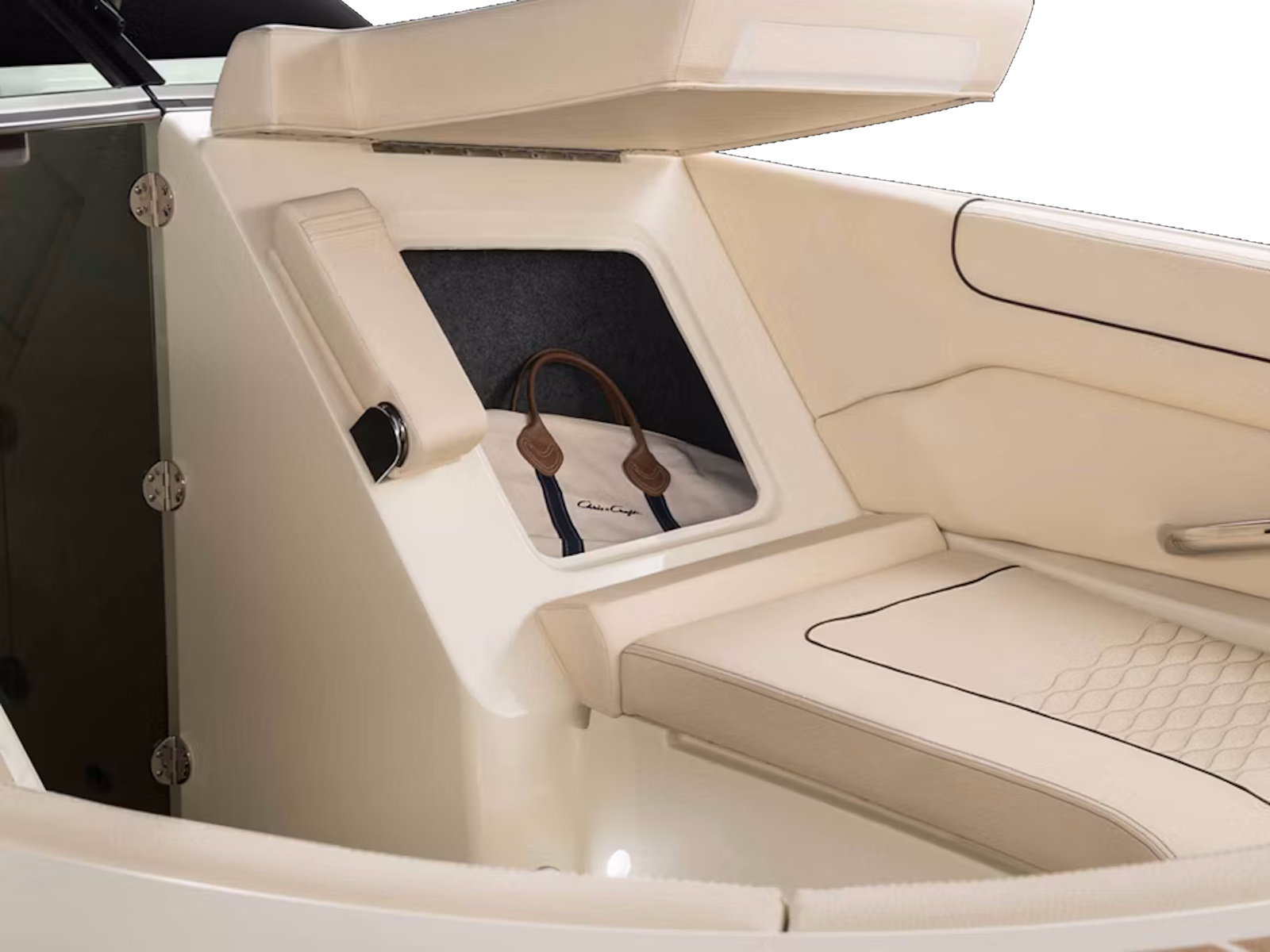 In the bow, plush forward-facing loungers feature fold-up armrests, a relaxed reclining position, and an integrated headrest. Stow fenders and other large items behind the backrests and beneath the seat cushions, as well as in the finished, in-floor storage lockers between these seats.