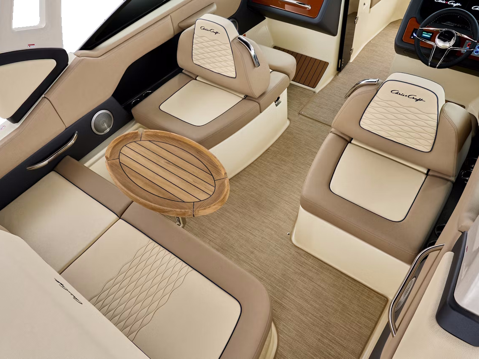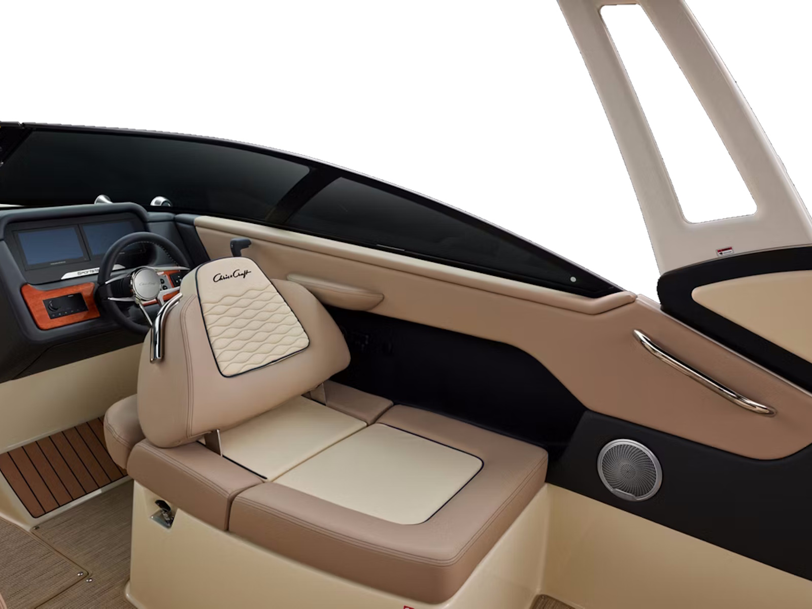 The Sportster 25 features a sleek dashboard with a custom Chris-Craft user interface to streamline navigation and controls. Enjoy teak accents and a leather wrapped stainless steel steering wheel.