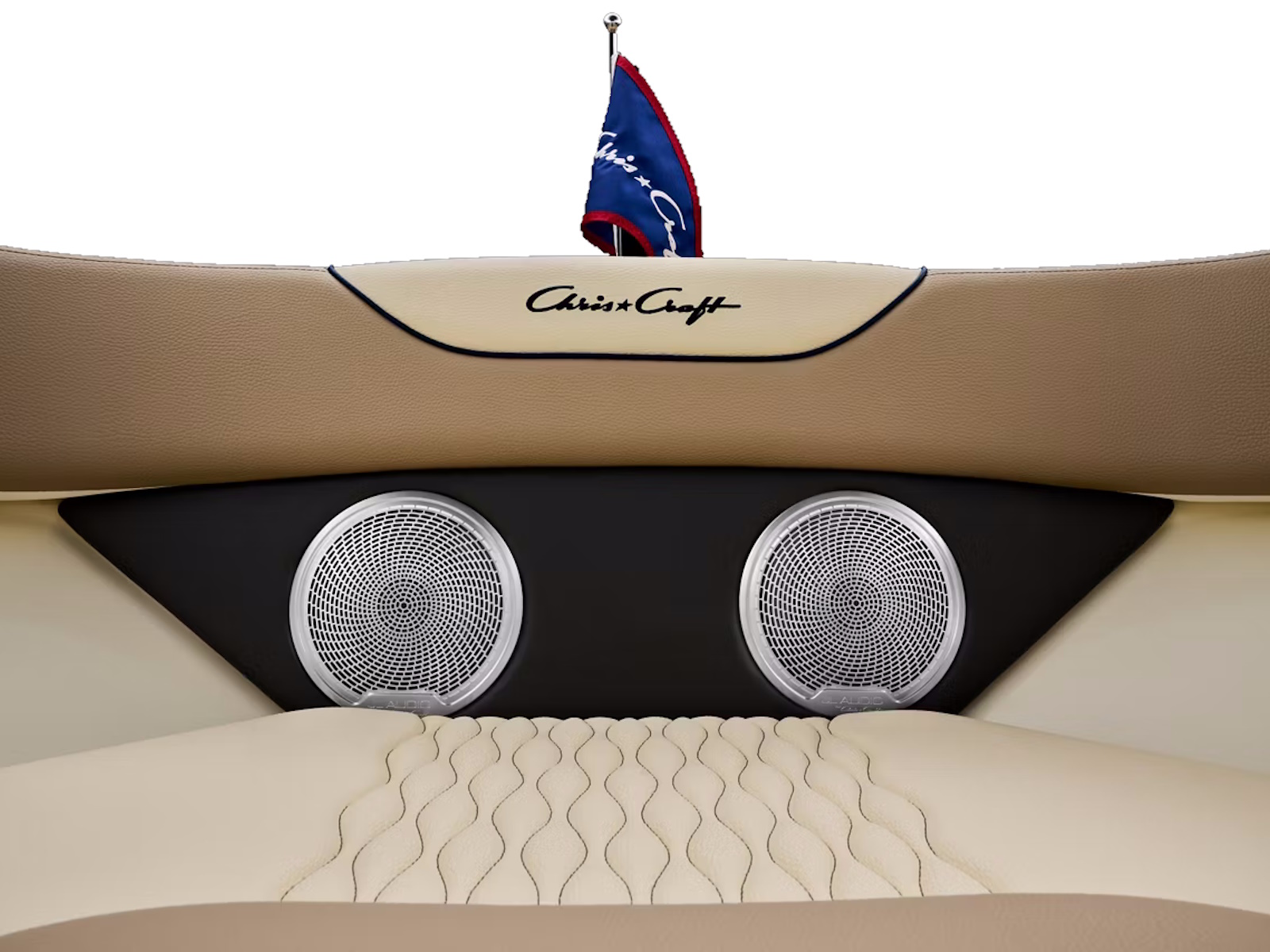 Enhancing your onboard experience, the Sportster 25 options include a premium audio system with 6 JL Audio Speakers and a 10" subwoofer, all elegantly finished with custom Chris-Craft stainless steel speaker grills, delivering superior sound quality and an unmatched level of sophistication.