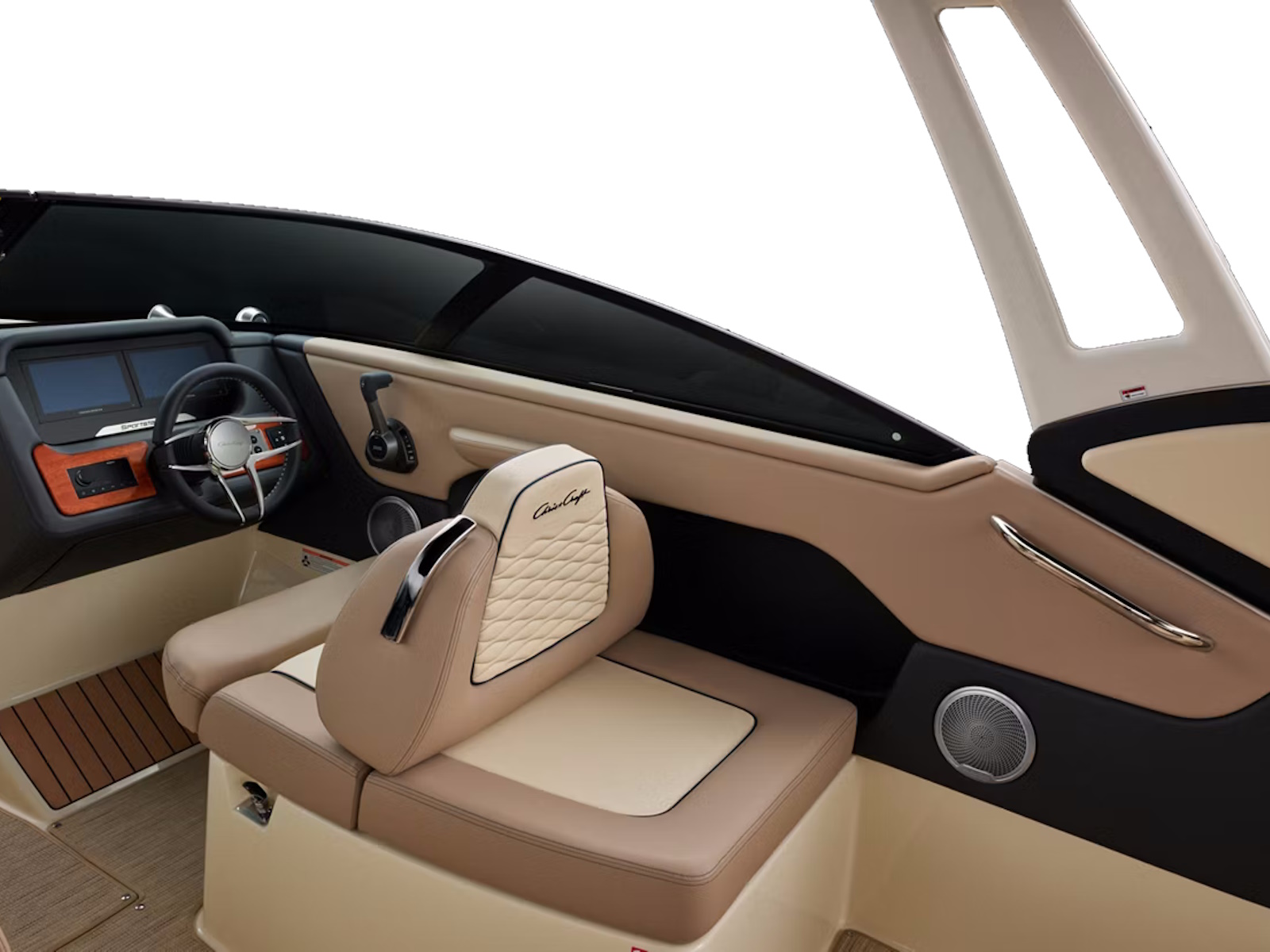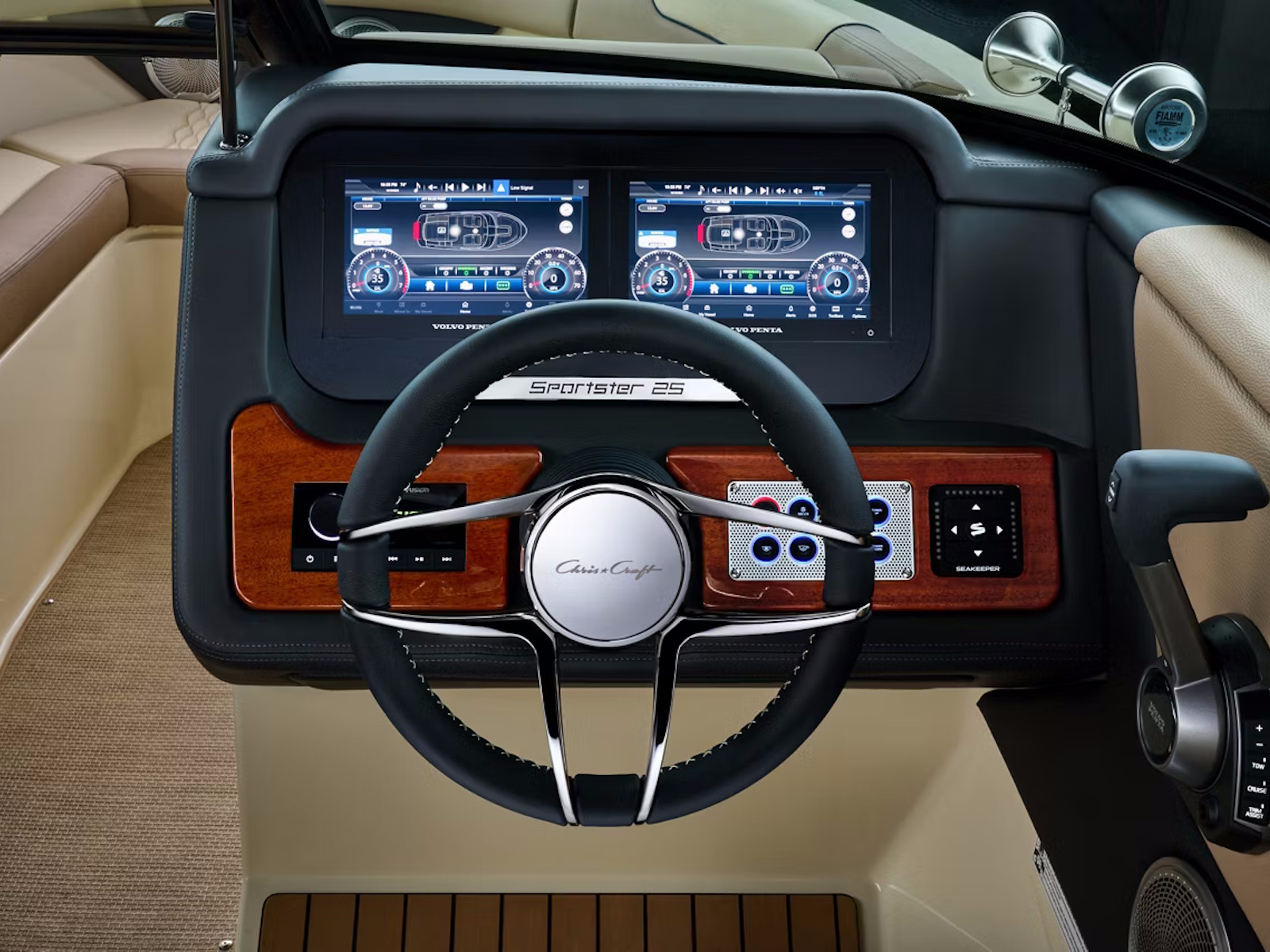 The Sportster 25 features a sleek dashboard with a custom Chris-Craft user interface to streamline navigation and controls. Enjoy teak accents and a leather wrapped stainless steel steering wheel.
