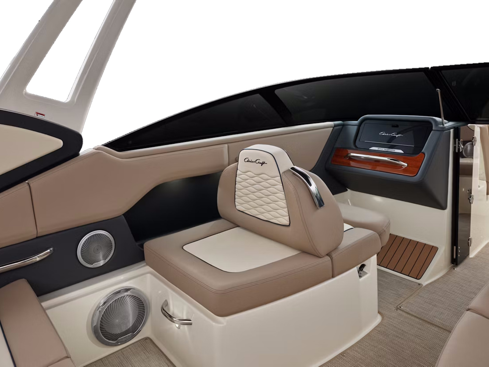Enhancing your onboard experience, the Sportster 25 options include a premium audio system with 6 JL Audio Speakers and a 10" subwoofer, all elegantly finished with custom Chris-Craft stainless steel speaker grills, delivering superior sound quality and an unmatched level of sophistication.