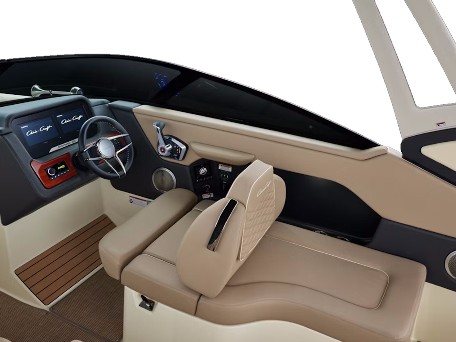 The Sportster 28 boasts a streamlined dashboard, integrating a custom Chris-Craft interface for effortless navigation and control. Refined teak accents and a leather-wrapped stainless-steel steering wheel elevate the helm, combining functionality with timeless elegance.