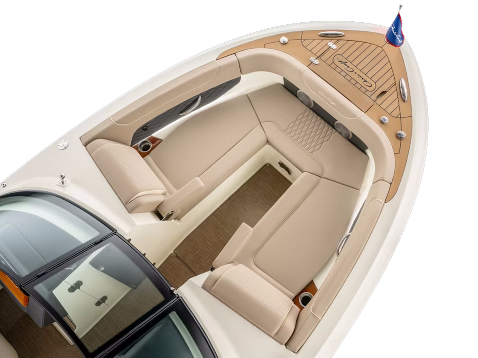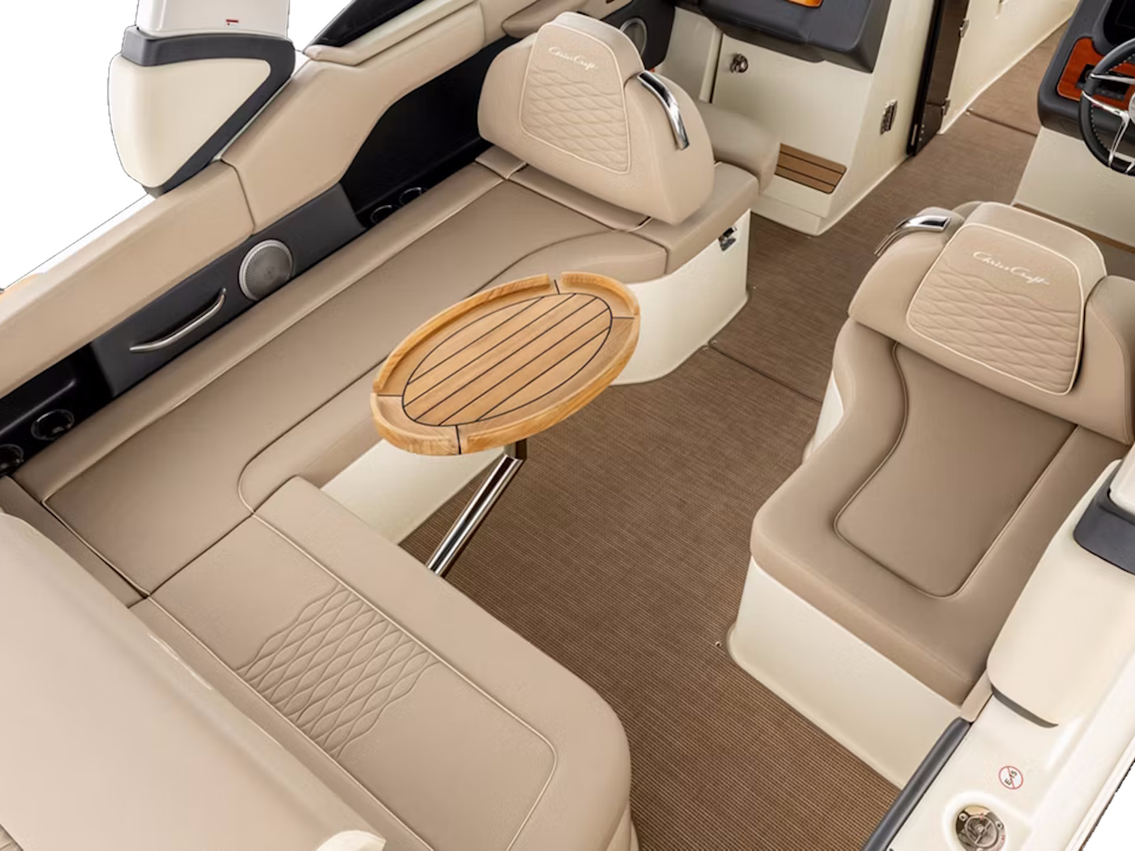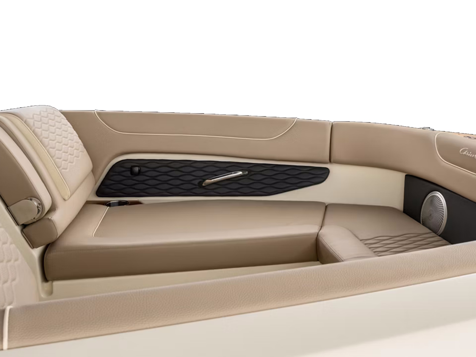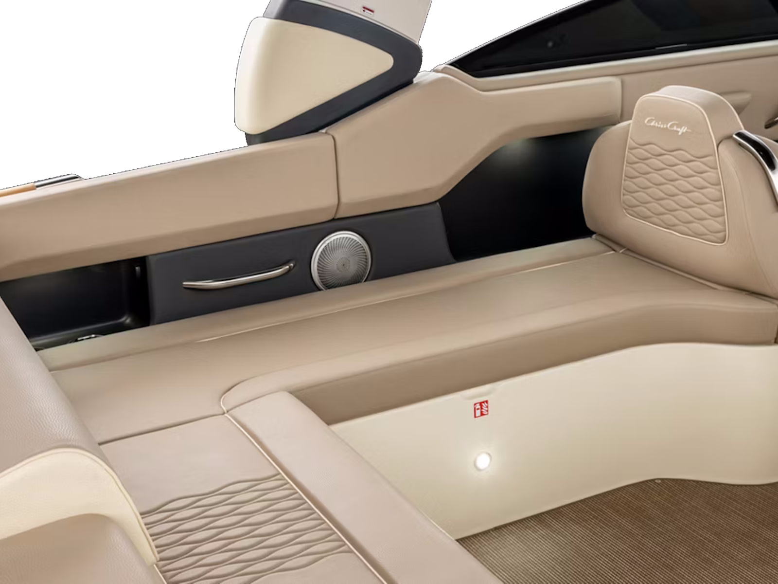Enhancing your onboard experience, the Sportster 28 options include a premium audio system with 6 JL Audio Speakers and a 10" subwoofer, all elegantly finished with custom Chris-Craft stainless steel speaker grills, delivering superior sound quality and an unmatched level of sophistication.