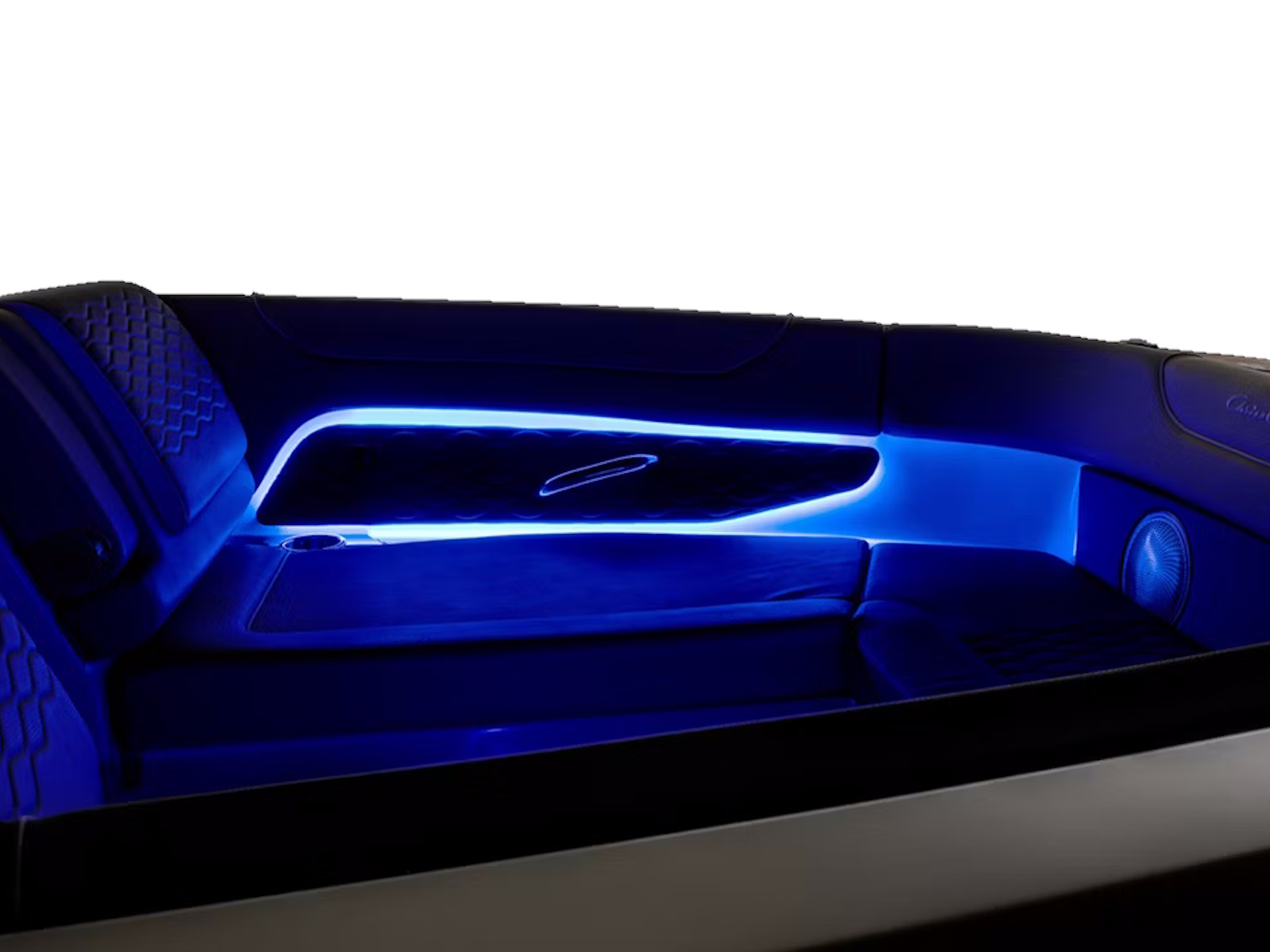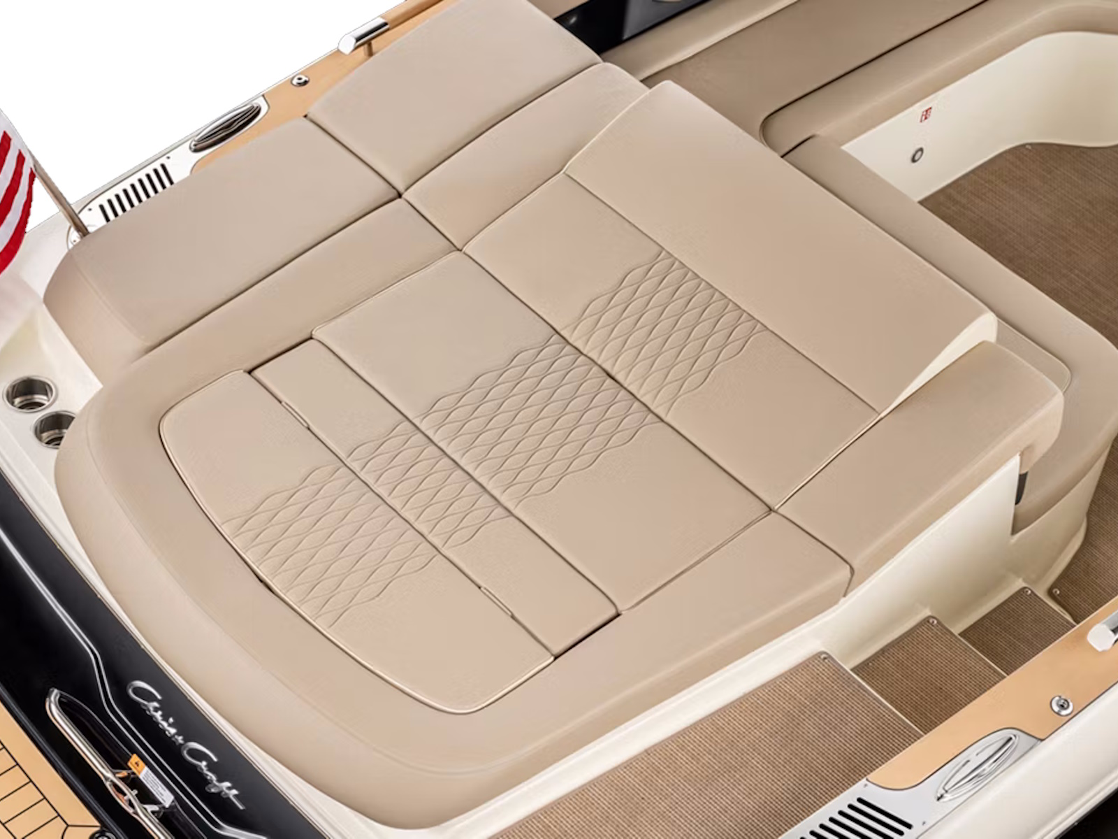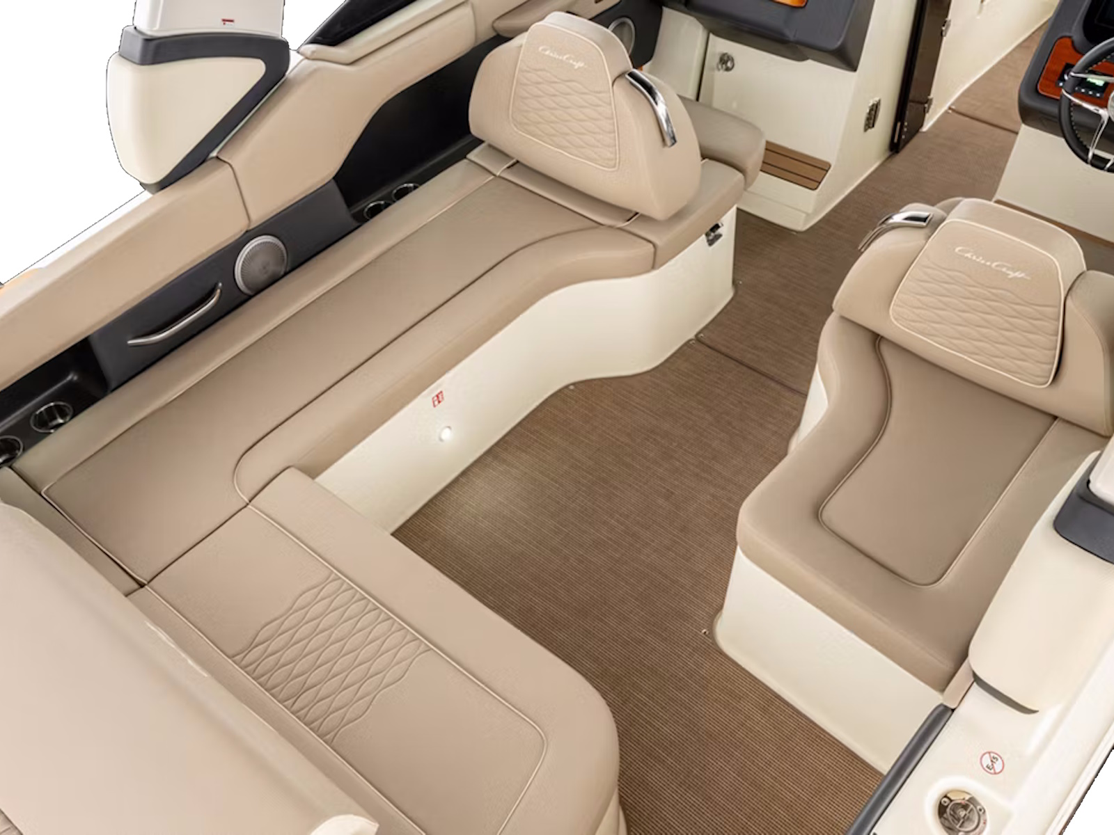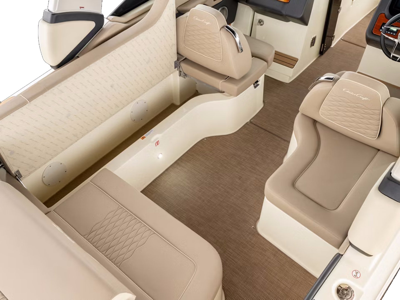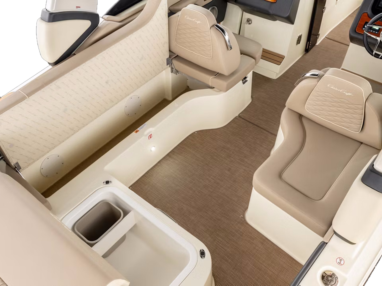 Enhancing your onboard experience, the Sportster 28 options include a premium audio system with 6 JL Audio Speakers and a 10" subwoofer, all elegantly finished with custom Chris-Craft stainless steel speaker grills, delivering superior sound quality and an unmatched level of sophistication.