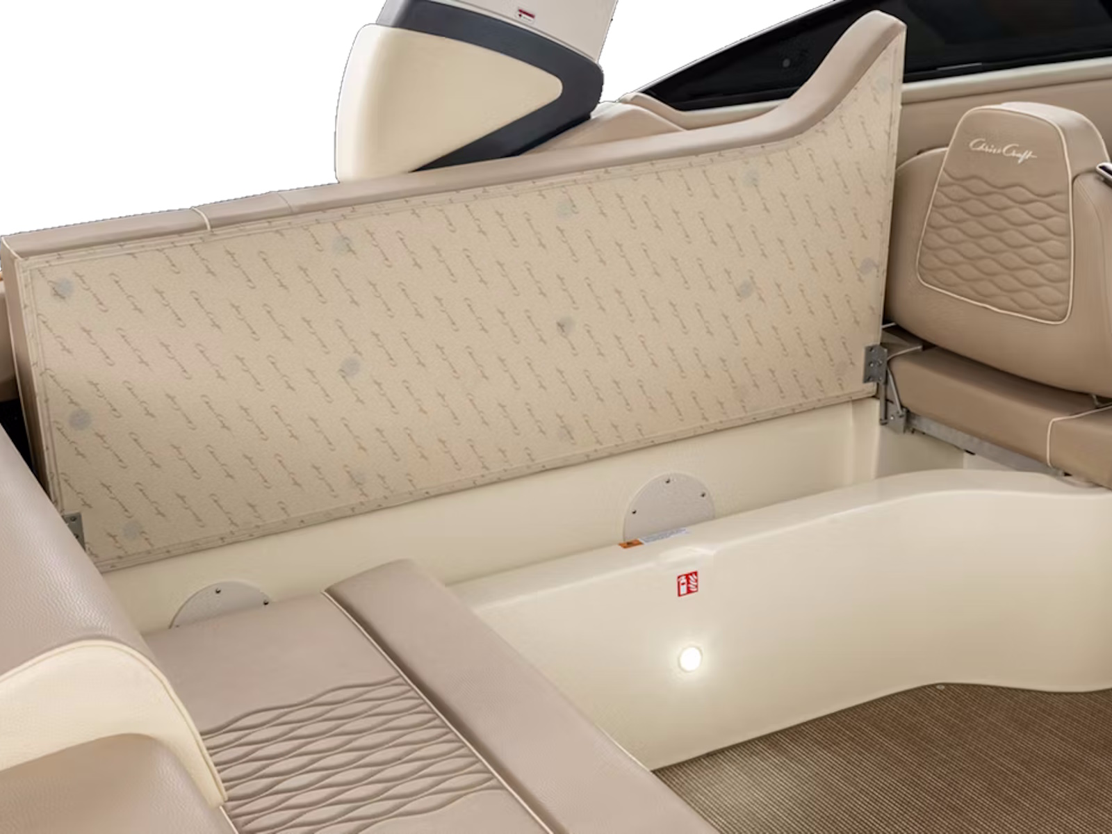 The sunpad offers a flip-up backrest for ultimate lounging comfort, making it the perfect space to relax and unwind. Beneath, multiple transom storage areas provide ample room for essentials. Midship and port-side aft compartments add further convenience, ideal for stowing ski ropes, dock lines, or favorite beverages, ensuring your gear is organized and your adventures are effortless.